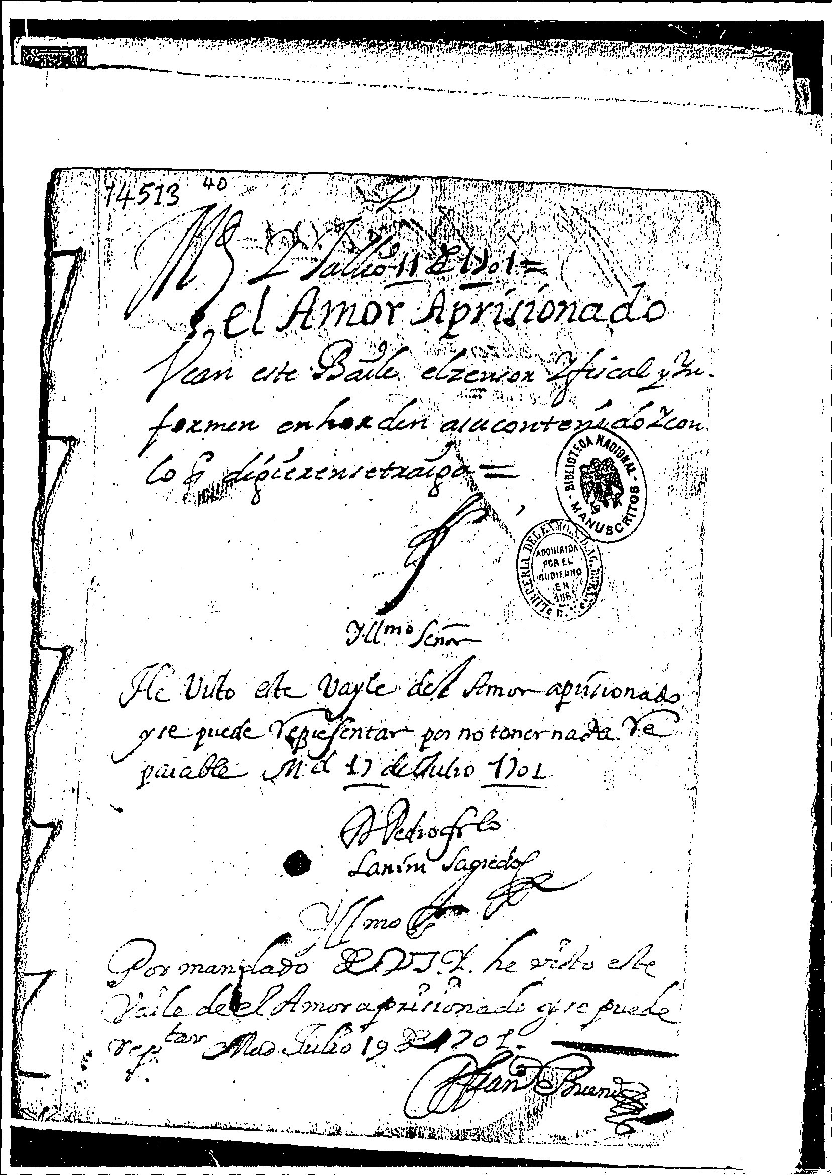 Notas: 1) 75 hojas 2) Portada: "M[adri]d y Jullio 11 de 1701 / "Vean este baile el zensor y fiscal y informen en horden a su contenido y con lo q[ue] digieren se traiga 3) En la portada se incluye también una primera licencia, dada en Madrid (17/09/1701) y firmada por D. Pedro Fr[ancis]co Lanini Sagredo, con rúbrica, y una segunda licencia también dada en Madrid (19/07/1701) y firmada por D. Francisco de Buend. con rúbrica 4) Formato pequeño. La suelta entera (cosida) mide 14 x 20 cm; las hojas 13 cm. de ancho 5) Correcciones menores en f.2r, f.3r, f.4r y f.4v; en éste se indica "quatro caras en aspe" y "+dos en + y bueltas en las esquinas" (movimientos de baile) 6) Lleva una rúbrica al final MC |