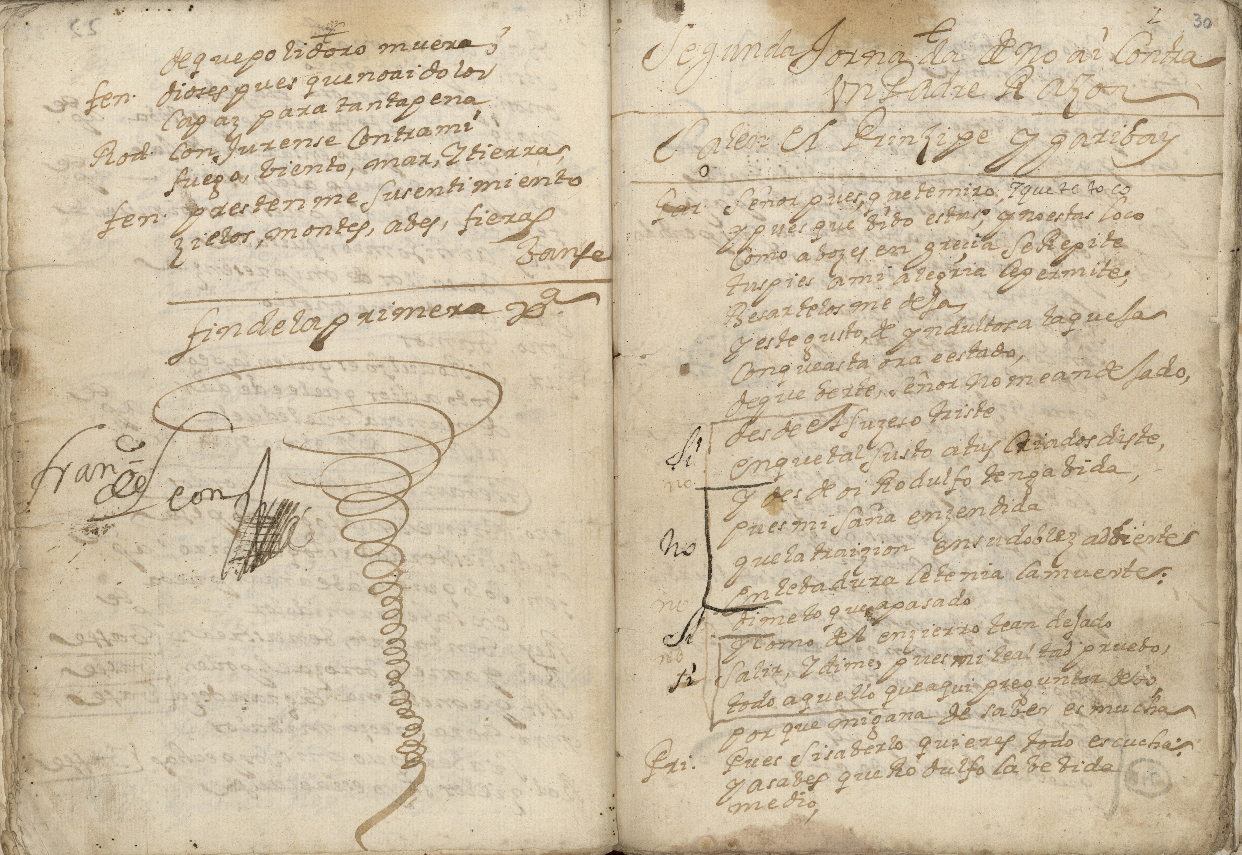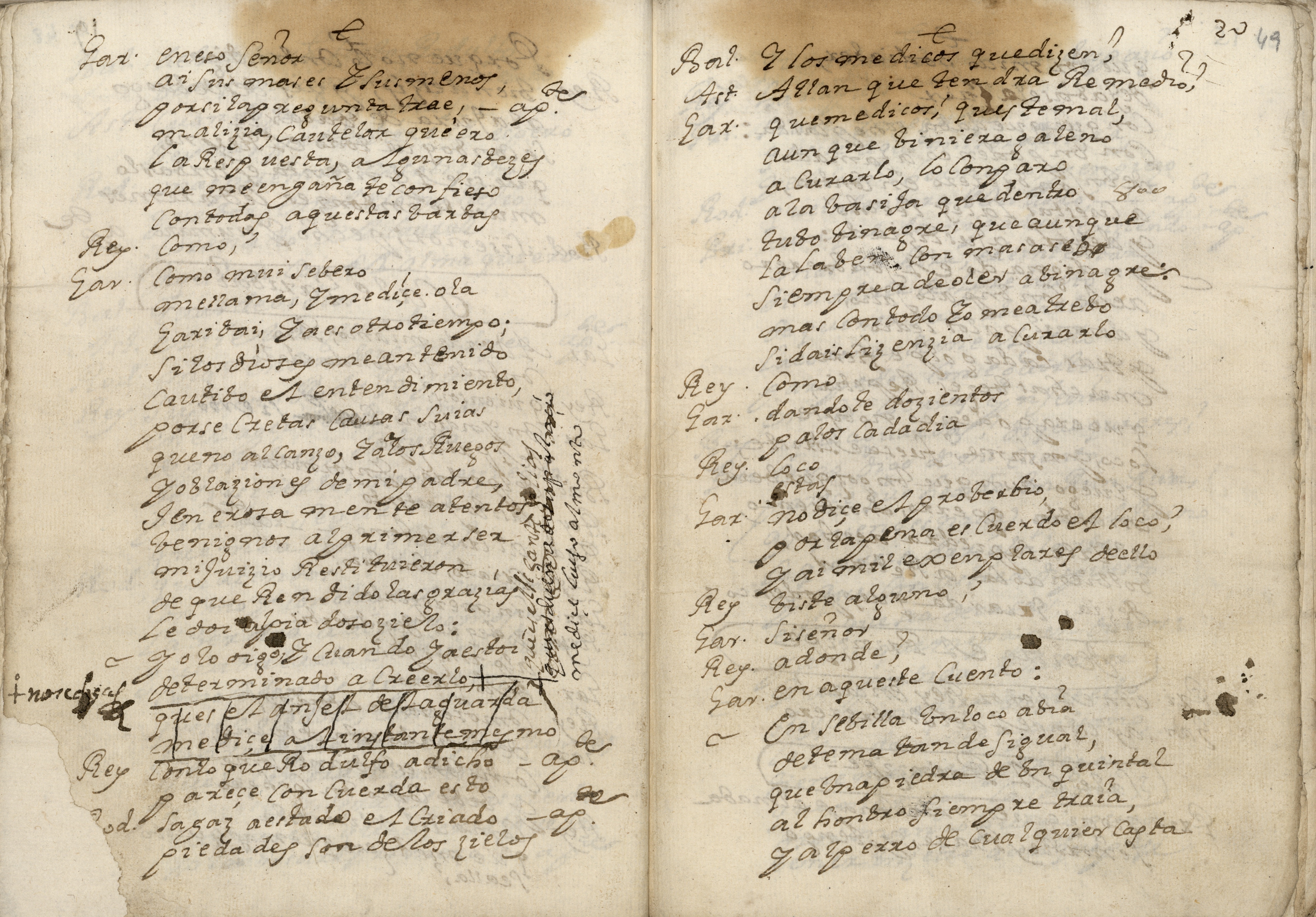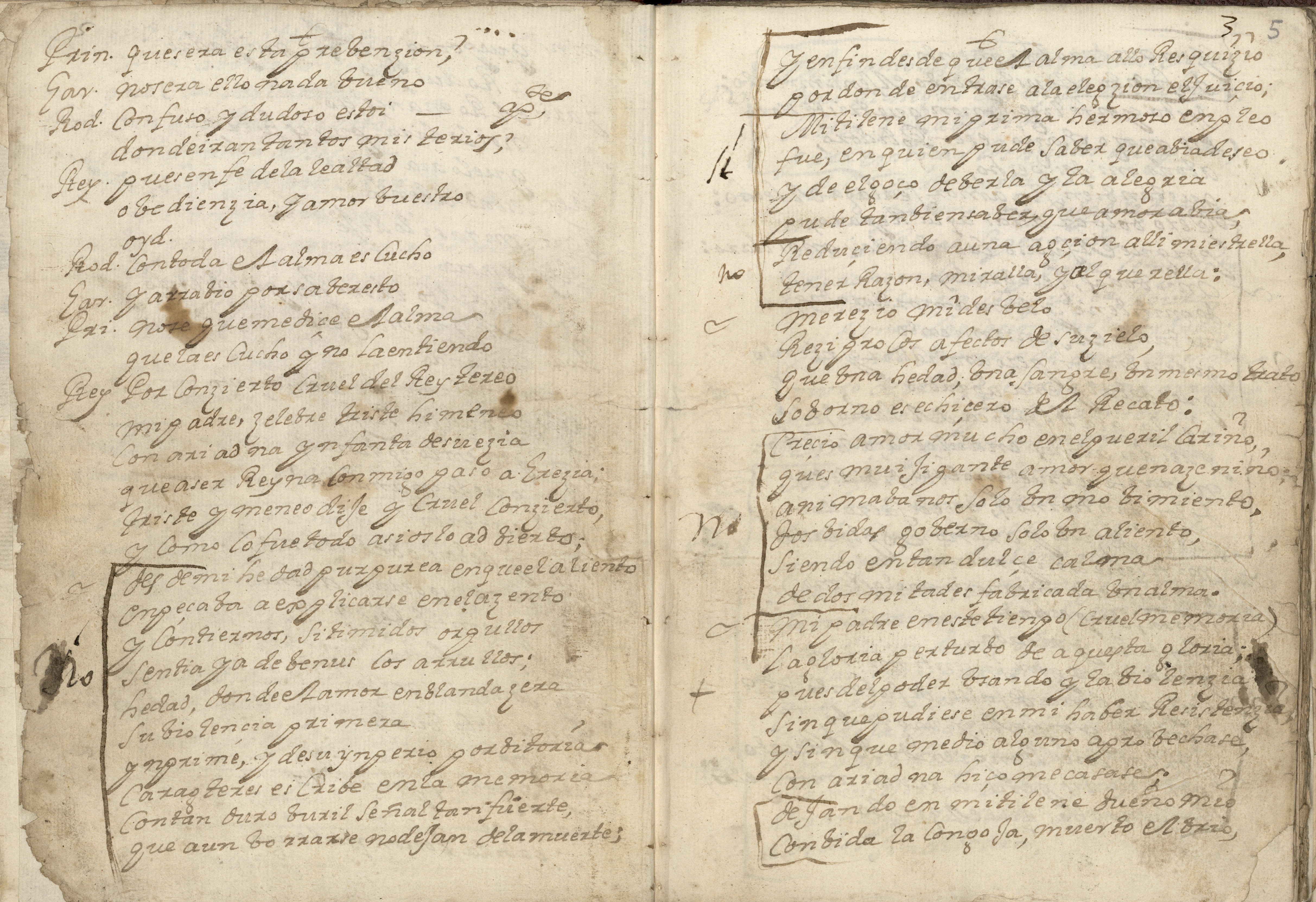 Notas: 4º, 80 h. (numeradas de forma independiente en cada jornada). 1) PM: Autógrafa y firmada en Málaga, a 13/04/1673: "Sub correctione sante matris eclesie | en malaga a 13 de Abril de 1673 | D. Fran.co. de leiba | Ramrz. de arellano | 2) Los dos primeros folios del manuscrito (f. 3 y h. 4) están muy deteriorados y han sido restaurados. En f. 3 se lee: "No ai contra un padre razon | de d. Fran. co de leiba". Se detallan a continuación las personas que intervienen en la obra. 3) Acotaciones en texto enjaulado, numerosas indicaciones respecto a "sí", "no", y "no se diga", tachaduras, algunas marcas y correcciones de otra(s) mano(s) como en f. 4, 9v, 12r-v, 13v, 15r-v, 25r, 28r, 31v, 44v; en algunos casos, serán atajos hechos por la censura de Lanine, y marcados con su rúbrica. 4) En f. 29 v y 54, final de J 1 y J2, firma y rúbrica de Francisco de León. ¿Tal vez el Francisco de León, apodado Cuernos de Oro, documentado en DICAT como actor entre 1670 y 1694, y de autor de comedias en 1677 y 1694? 5) MG: La mano del texto y de la firma Francisco de León me parece igual a la del manuscrito, y de la "firma" de Leiva Ramírez de Arellano. Por lo cual habría que tener otra confirmación de la mano de Leiva Ramírez de Arellano para confirmar que sea autógrafo el manuscrito. 6) En f. 55 aparece en blanco con única escritura en la parte superior donde se lee "conde alarcos". 7) En f. 80 v aparece la censura, firmada en Burgos a 17 de julio de 1683 por Fr. Diego Pozo. A continuación, firma del 3 de agosto de 1685. Finalmente, licencia de representación, "observando que no se diga lo prevenido y atajado en todo ella", fechada en Madrid el 9 de agosto de 1685 y rúbricas de Pedro Francisco Lanine Sagredo y Fermín de Sarassa. 8) En f. 48v, dos líneas atajadas con la nota al lado "No se diga" y la rúbrica de ?Lanine?; líneas corregidas entradas en la margen. (MG) |