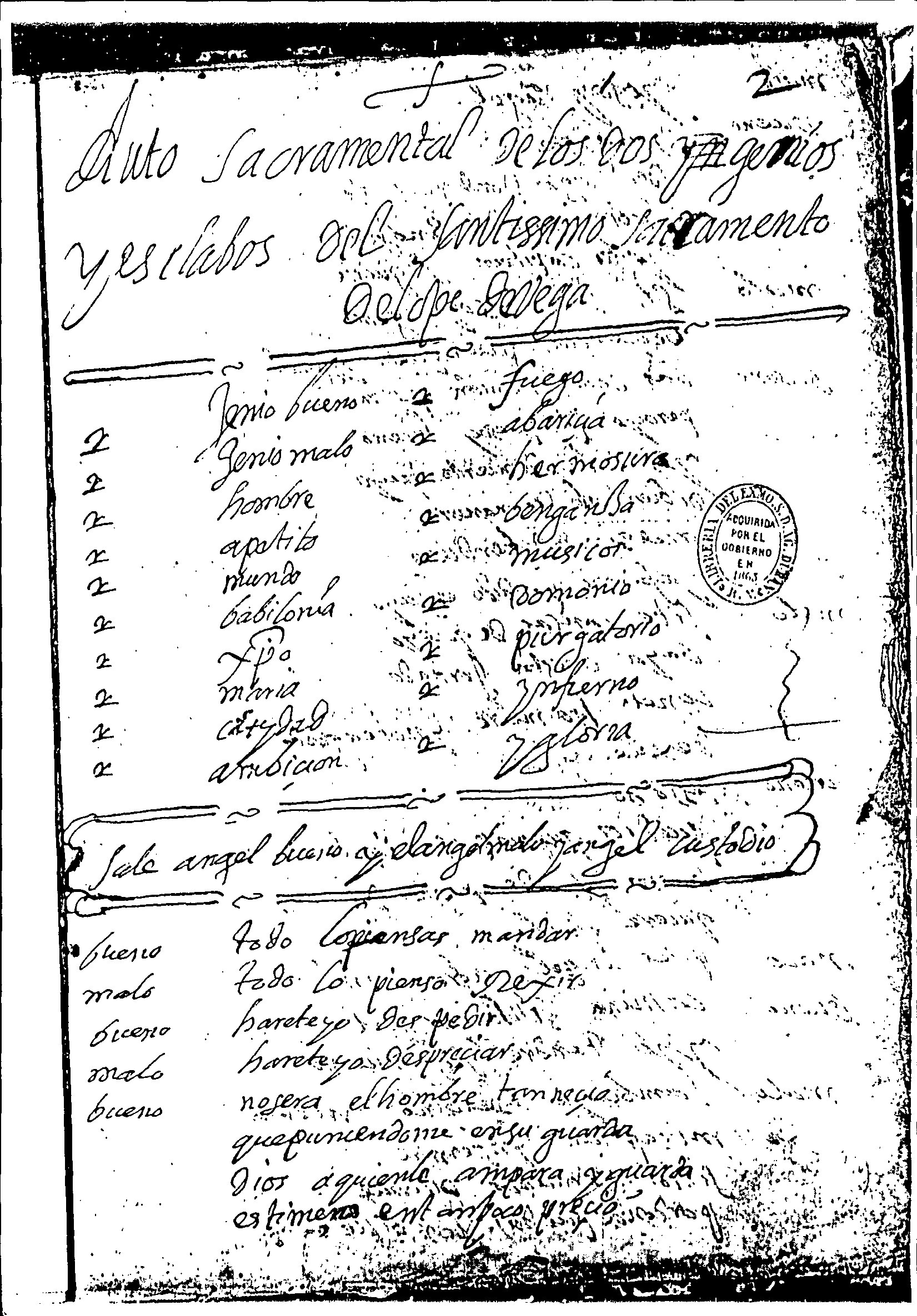1) Ms. 3004, 15.315 (BNE), Lope de Vega, Auto sacramental de los dos ingenios y esclavos de Santisimo Sacramento 2) Uso frequente de "x" - rexir (regir); dexar 3) Uso de "ff" - offende 4) Letras no en la hoja actual - R mayus., x, est, p (ver hoja alfabeto) |