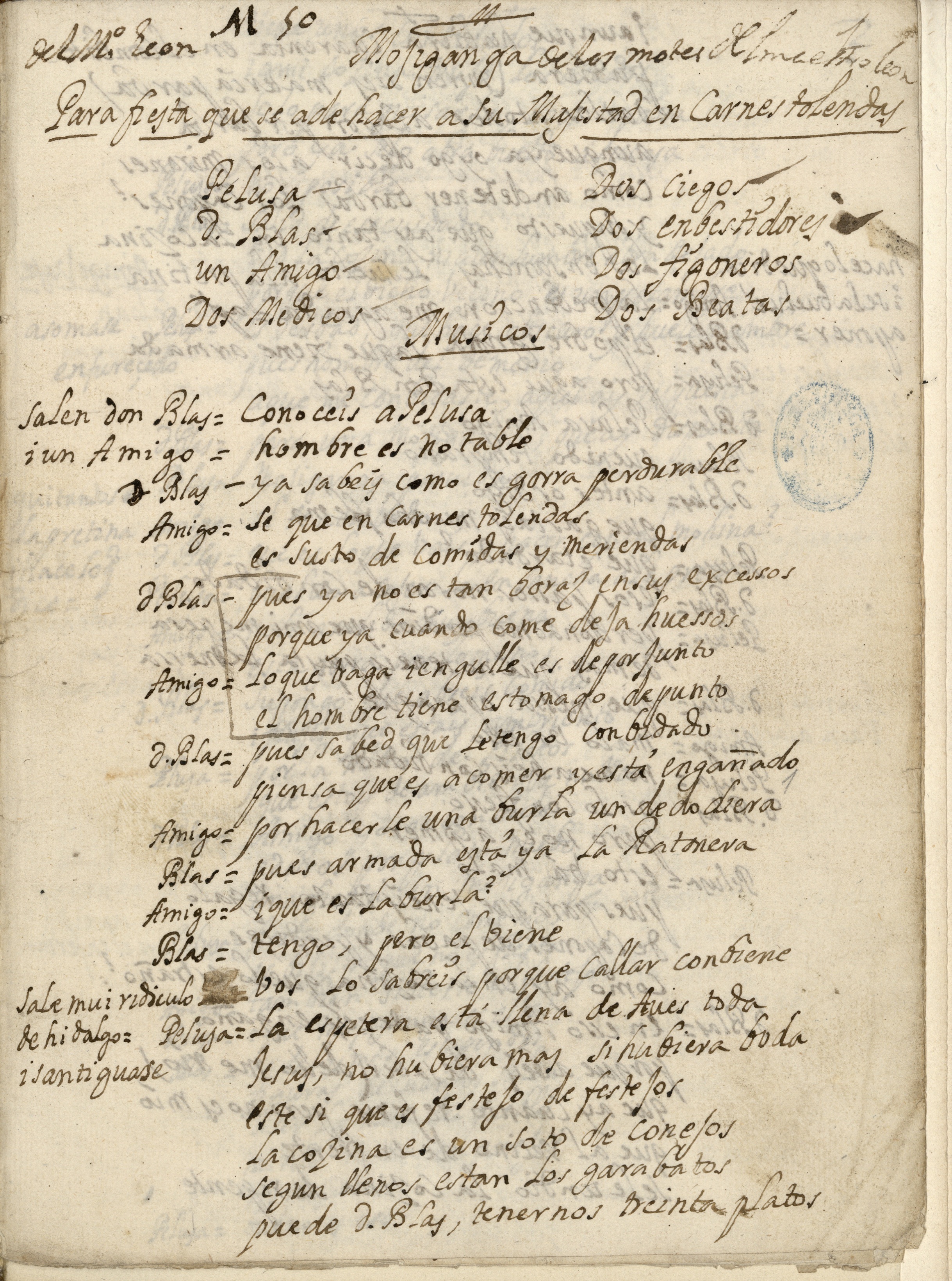 1) Ms 1424, BNE 15.358, Juan Manuel de León Merchante, Motes (Los). Mojiganga... para fiesta a S. M. en carnestolendas 2) Usa la i latina en vez de la i griega a momentos: "mui", "i santiguase", "i un amigo" 3) Usa la doble "s" a momentos: "passos", "messa", "osso", "huessos" 4) No siempre usa la "h" inicial: "evenido", "abéis", "ay", "undio", "huessos" |