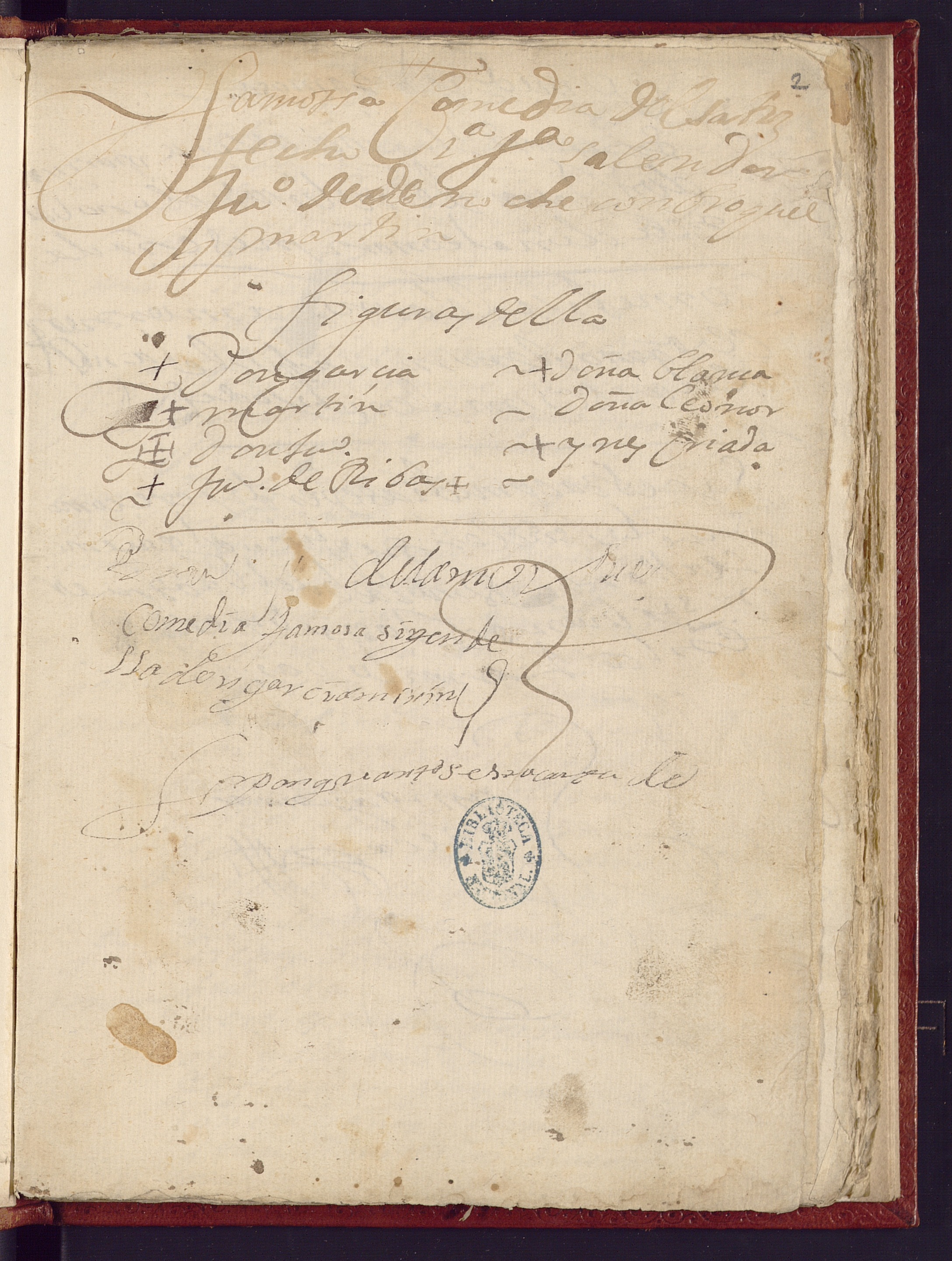 Notas: 1) PM: 55 hoj., 4º, pasta 2) PM Impresa suelta 3) PM: Al fin: “En Sevilla 24 de julio de 1634. Luis de Belmonte Bermúdez.” Pero no es letra suya. Licencias firmadas por Álvaro de Ataide en Mesa, 18 de mayo de 1639, y otra, todas del mismo año. Alguna de Lisboa 4) PM: La letra de la comedia parece de D. Antonio de Mendoza 5) MG: f. 52v: La firma sí parece ser la de Belmonte Bermúdez; es casi igual a la firma suya al final de "El sastre de Campillo"; ver. f. 74r de Ms. 0084 (BNE Res. 115) 6) Es cierto que a primera vista la letra se parece bastante a la de Antonio Hurtado de Mendoza en "Cada loco con su tema," BNE Ms. Res 93 7) Es una copia limpia, casi sin correcciones ni alteraciones 8) Hay palabras y garabatos difíciles de descifrar bajo la lista de personas en f. 2r, y en ff. 2v, y otros folios sin usar en copiar la comedia: 22r-v; bajo la última licencia en 53v, y en ff. 54v-55v, también hay declaraciones difíciles de descifrar; las de 53v tratan de la comedia pero las de 54v-55r parecen tratar del pago de un préstamo. En algunos de ellas se puede leer el nombre "Santiago Manteca" |