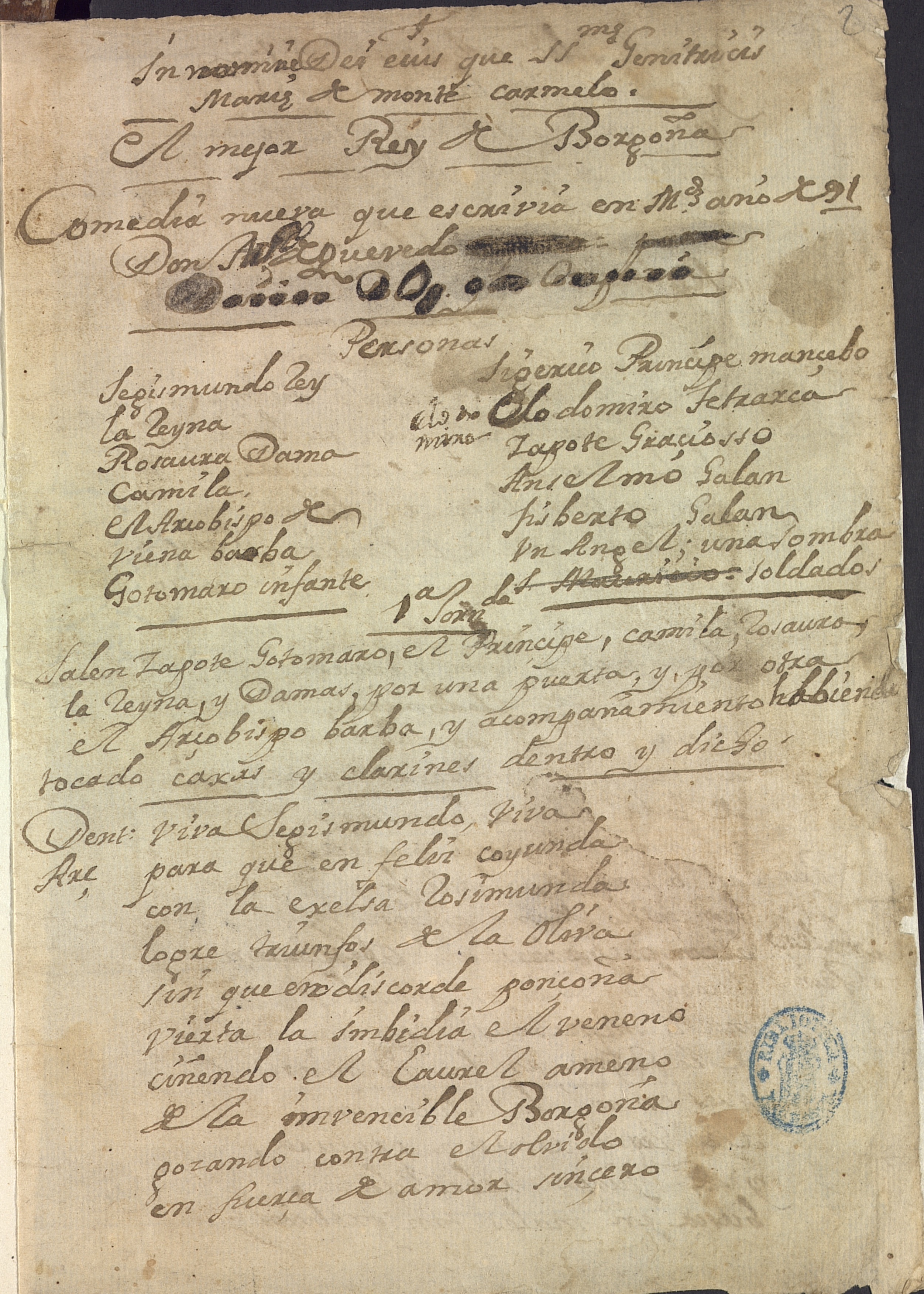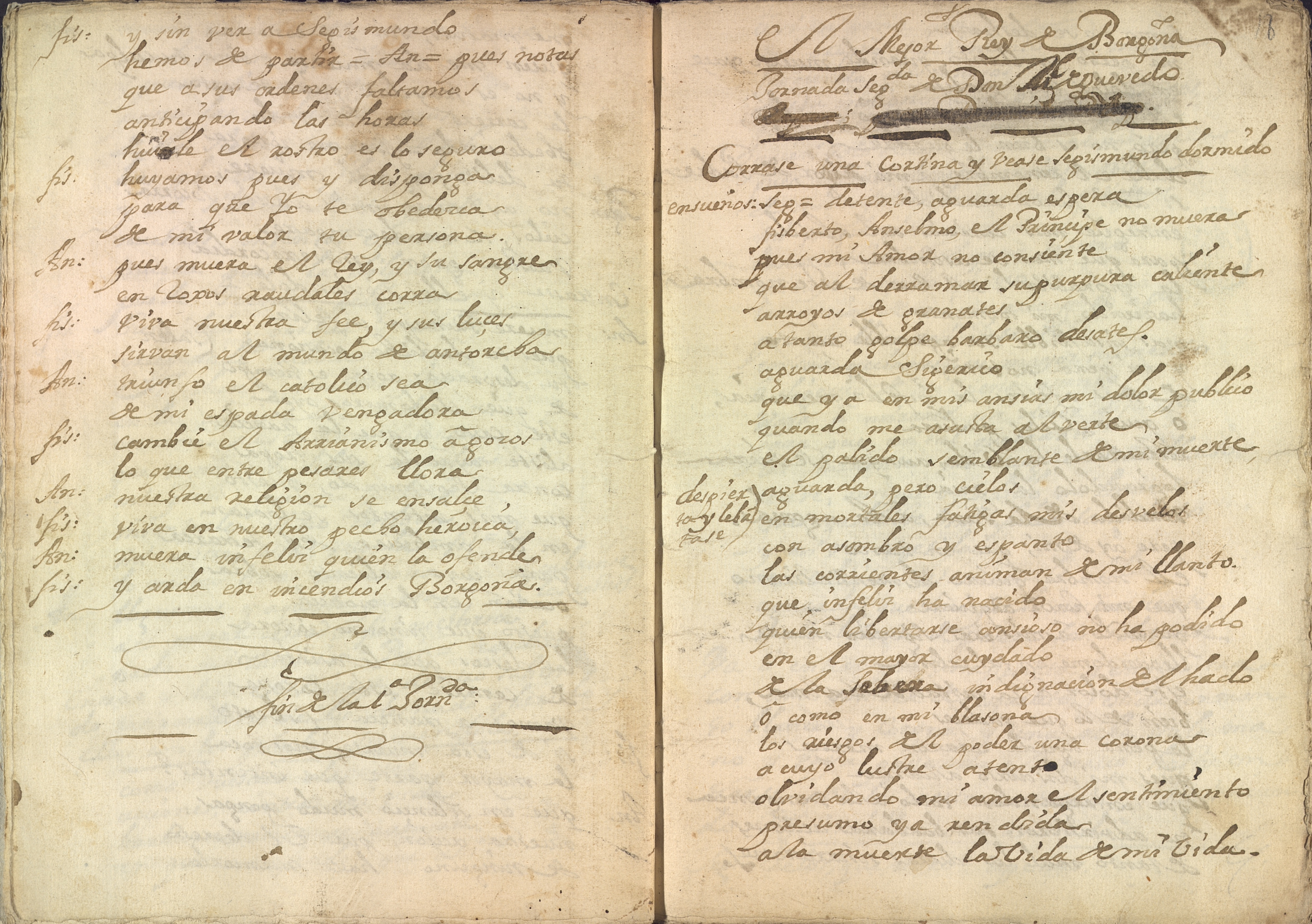 Notas: 57 hojas 1) PM: escrita para la compañía de d. Polop 1a) MG: no encuentro el nombre de Polop en el ms, a menos que sea en la línea tachada del título al principio de J1 y 2: f. 2r, f18r; tanto el título como el autor tachados a principio de J. 3, f. 36r 2) Muchas enmiendas hechas por el mismo autor |