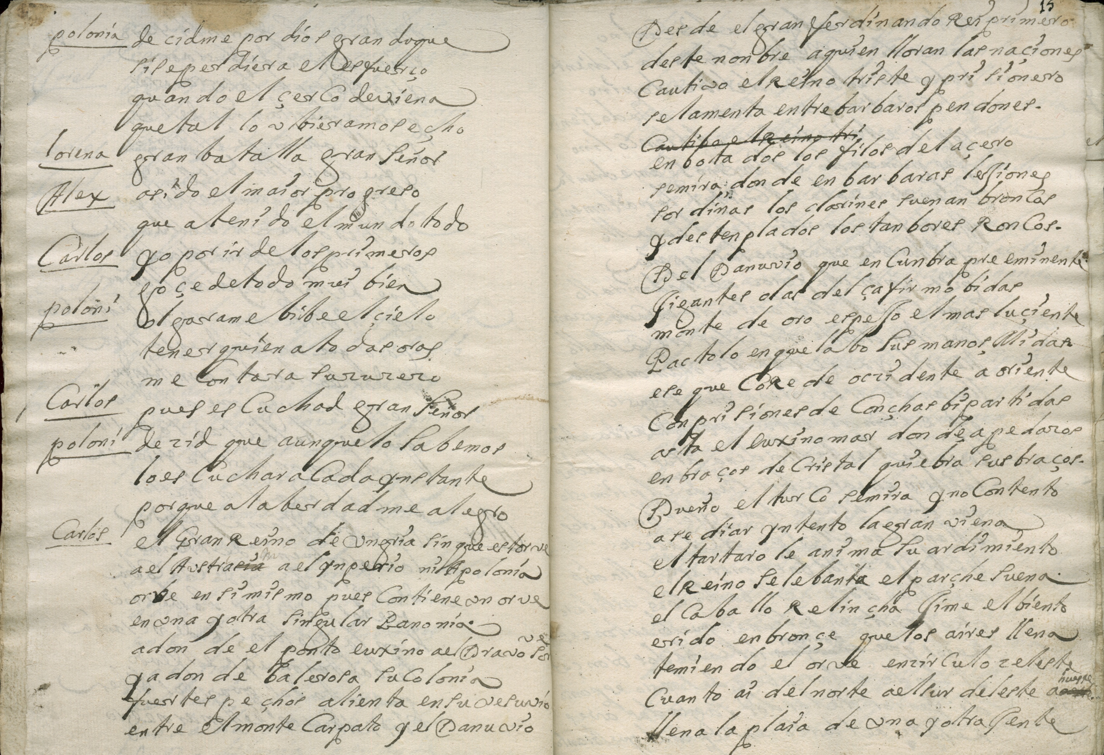 La mano principal: todo, incluyendo el reparto en f. 1r - con la excepción de ciertas enmiendas y de folios copiados por la segunda mano La segunda mano: ff. 28r-v, 30r-v, 39r; y varias enmiendas, incluyendo al final del manuscrito Comparar la letra con la de Francisco de la Calle, representante en la obra, según el reparto, y autor de un número de textos dramáticos. A menos que sea una de las manos que enmiendan, no se parece a la letra del ms. 15.204, "Los tres hermanos del cielo" de de la Calle. |