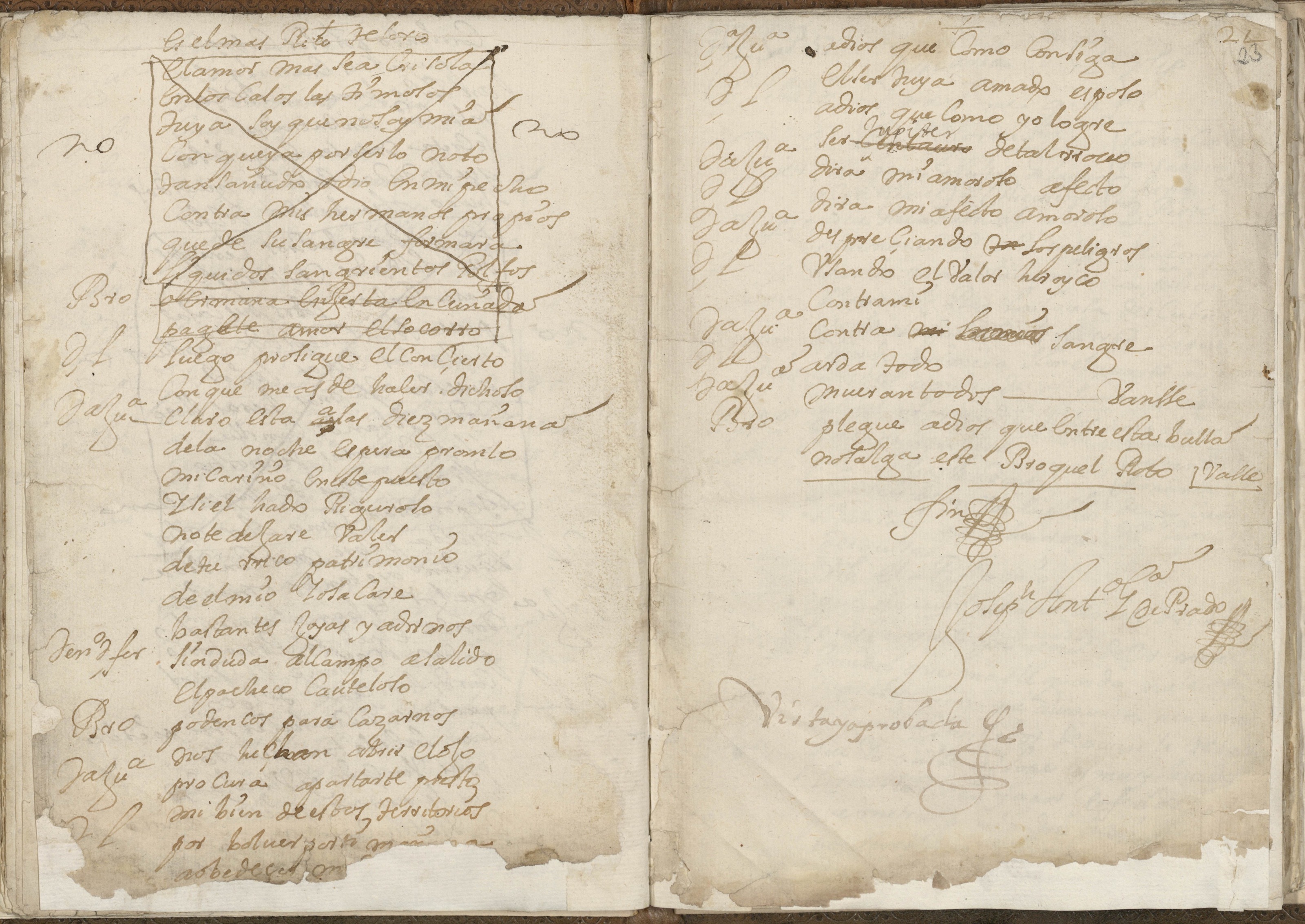 Notas: PM: Aprobación del censor Avellaneda, en Madrid, a 22/08/1674. Autógrafa y firmada al fin de la I jornada. PM da el título "Pachecos y Palomeques, o Los Bandos de Toledo" f. 2r - Portada, con la firma y rúbrica de García de Prado; en otra mano, se ha escrito abajo "Pensar" y en letra pequeña al pie de la página, "antonio pala??"