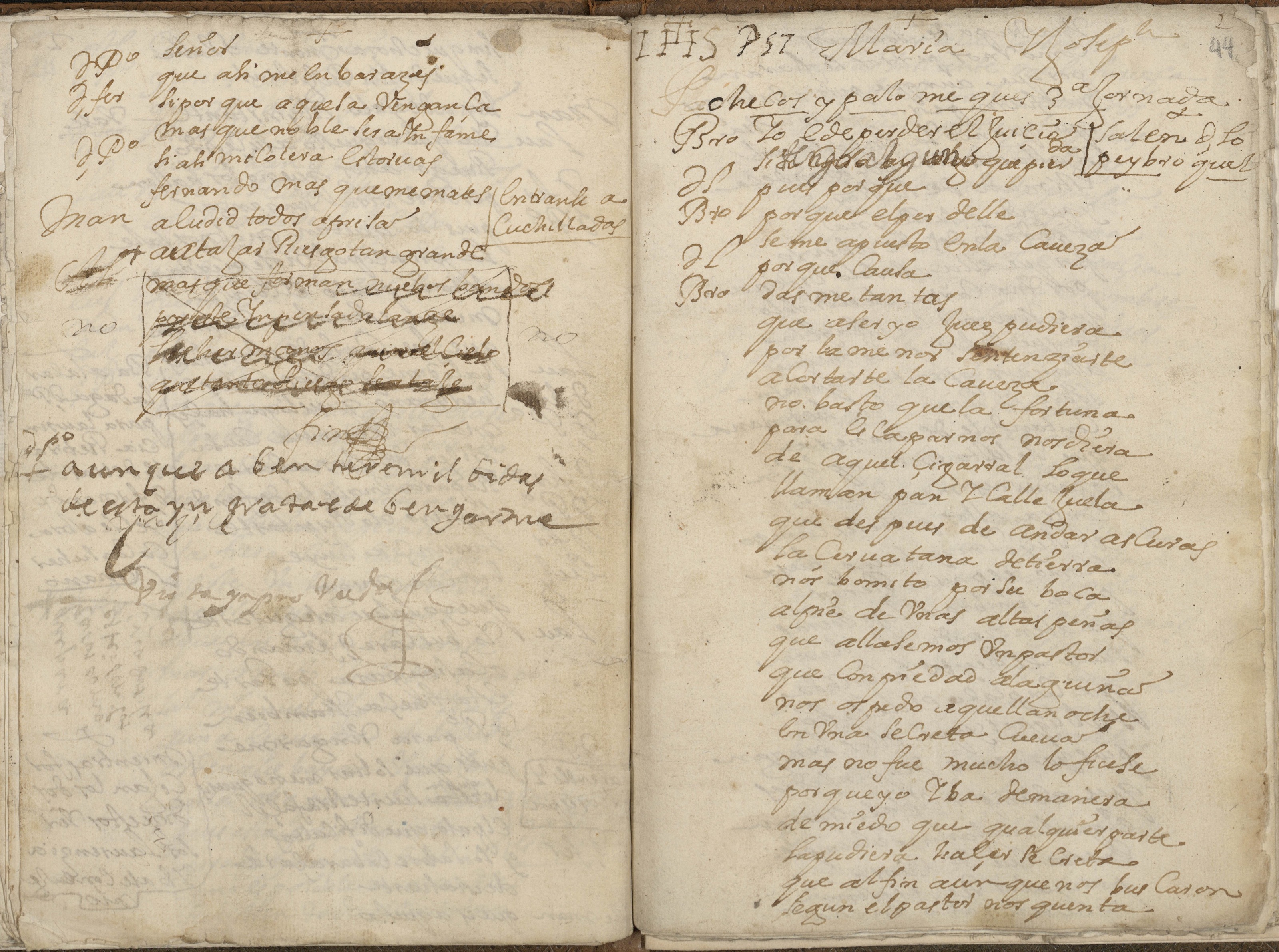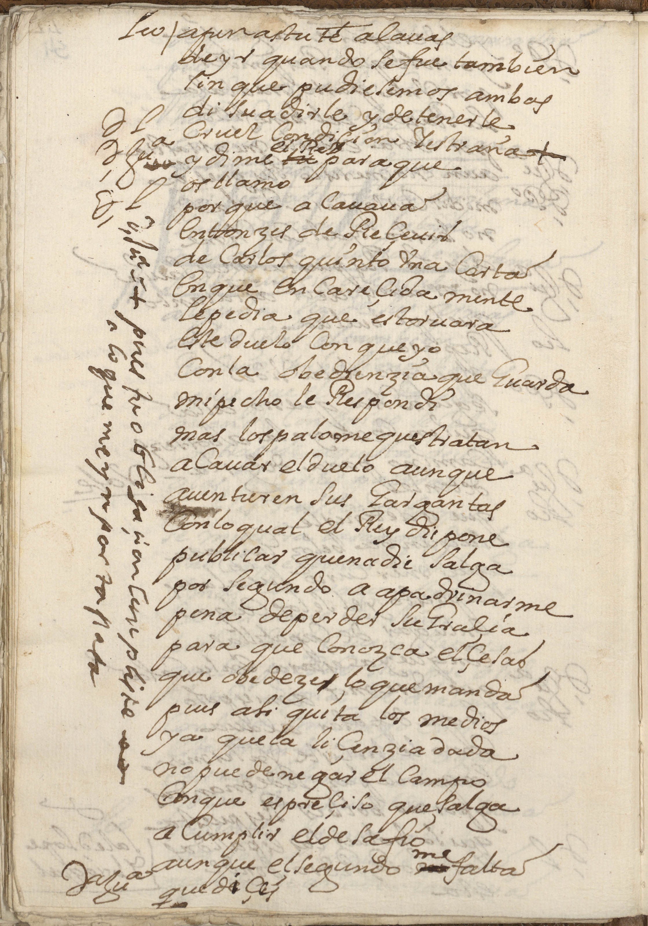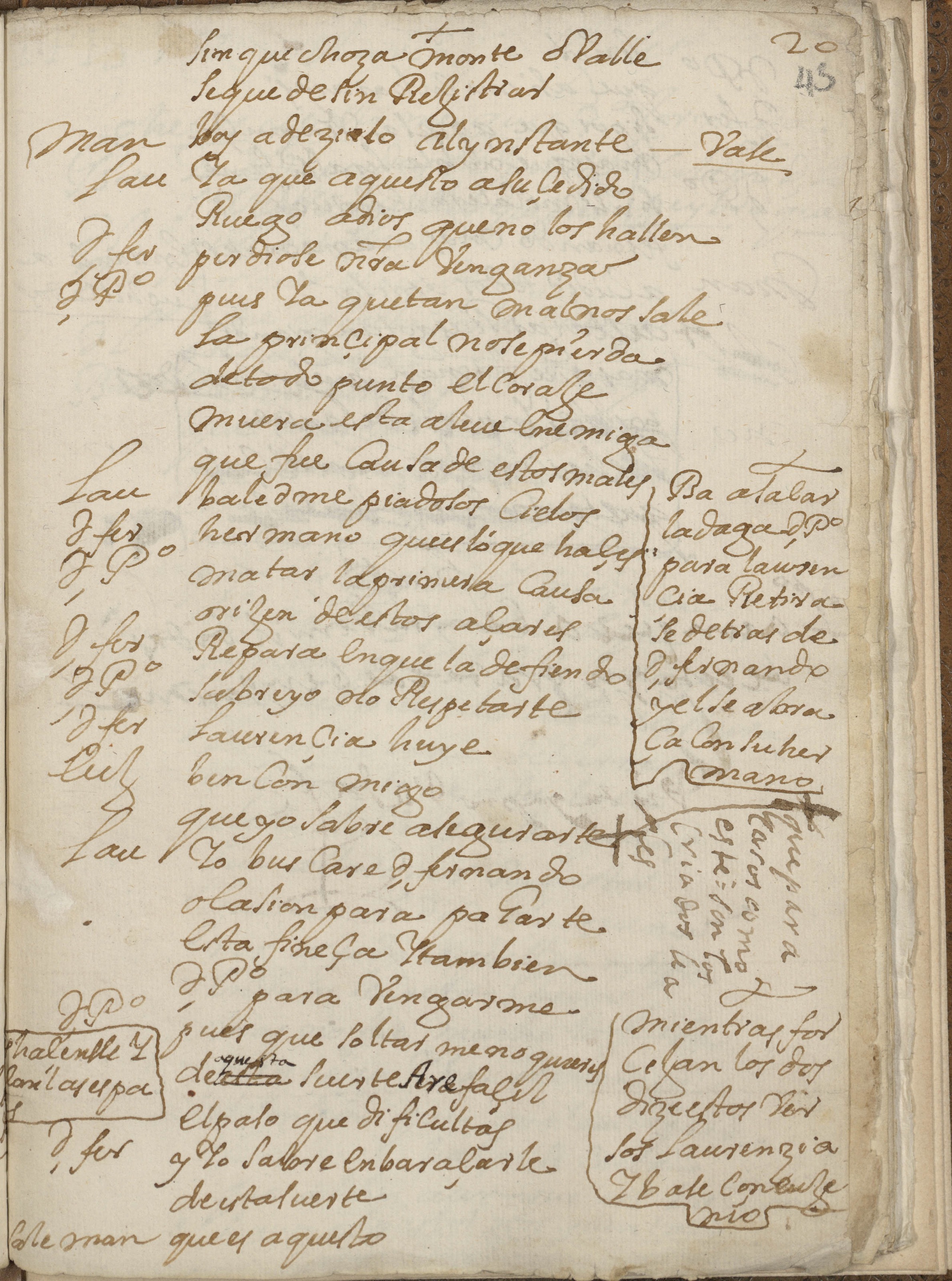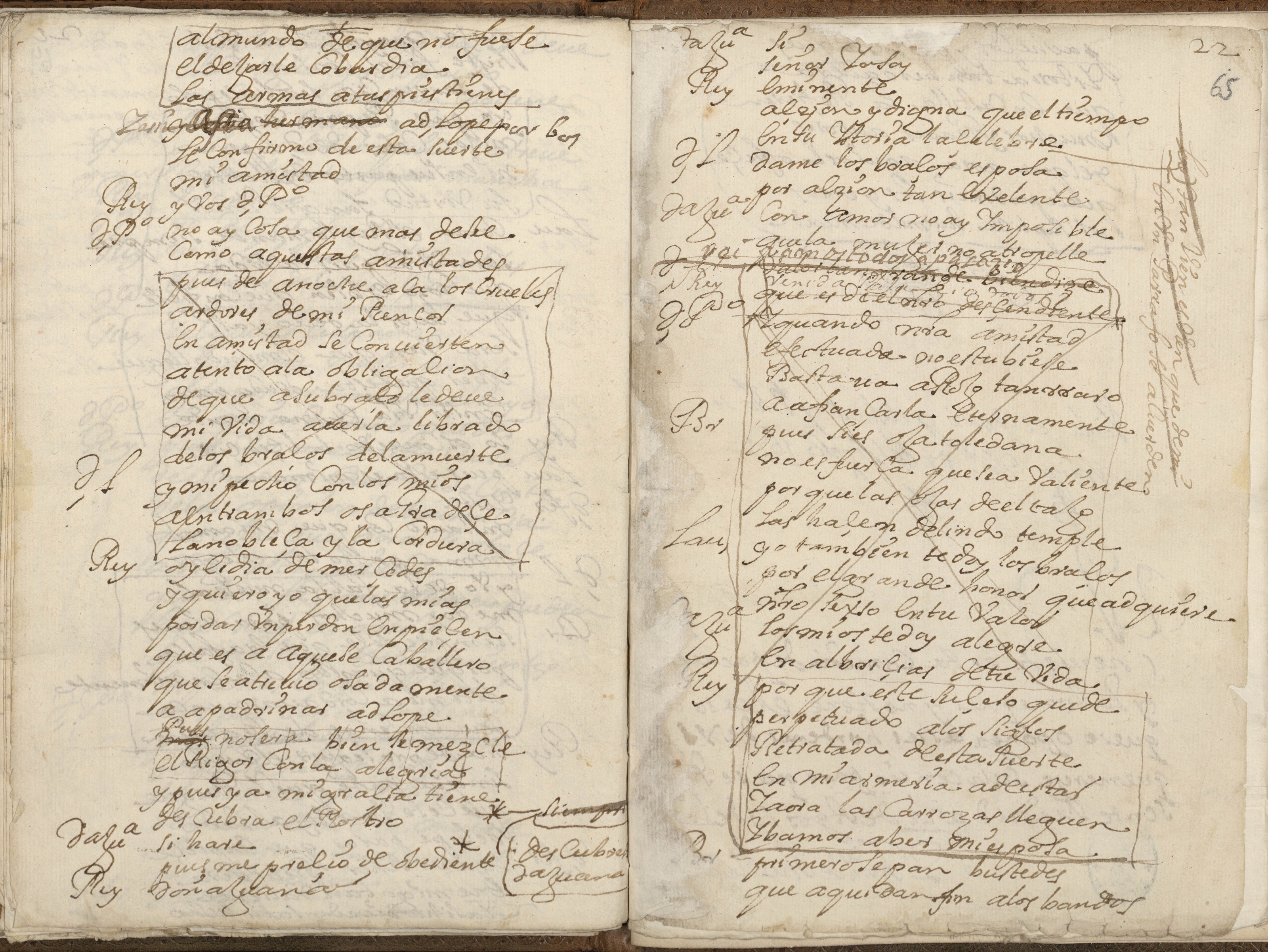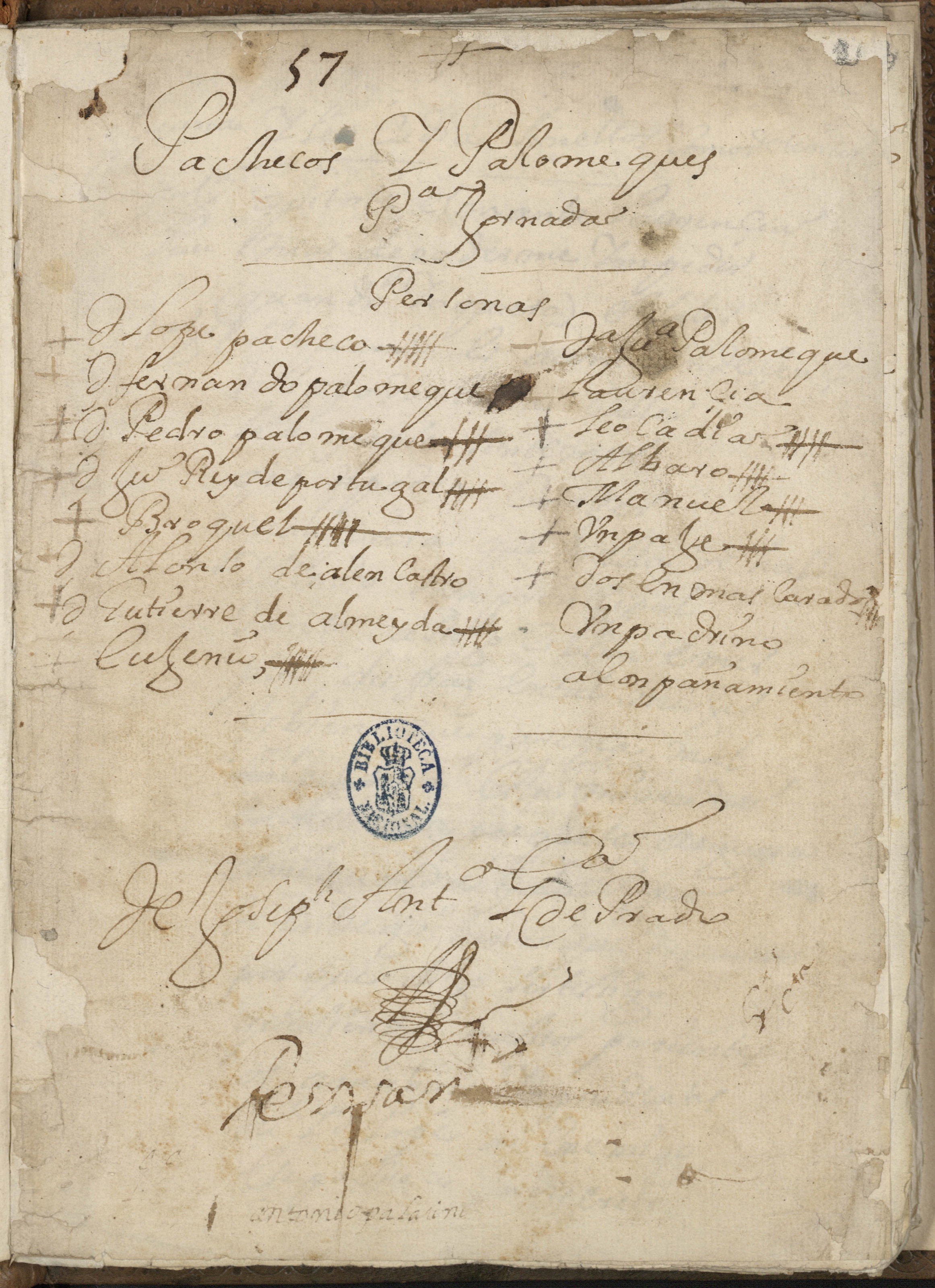 Ms. 1469, BNE Ms. 16.609, Antonio García de Prado, "Pachecos y Palomeques", 1) Mano que añade algunos versos: 2 versos añadidos en f.43v, uno en f.54v, parte de un verso en f.63r, y la palabra "bos" en f.64v; y tal vez el verso añadido en f.65r: "rei vamos todos a palazio"; 2) Pluma gruesa, tinta negra, letra casi de molde en parte 3) Muestra muy pequeña 4) Apuntador con García de Prado? - verificar |