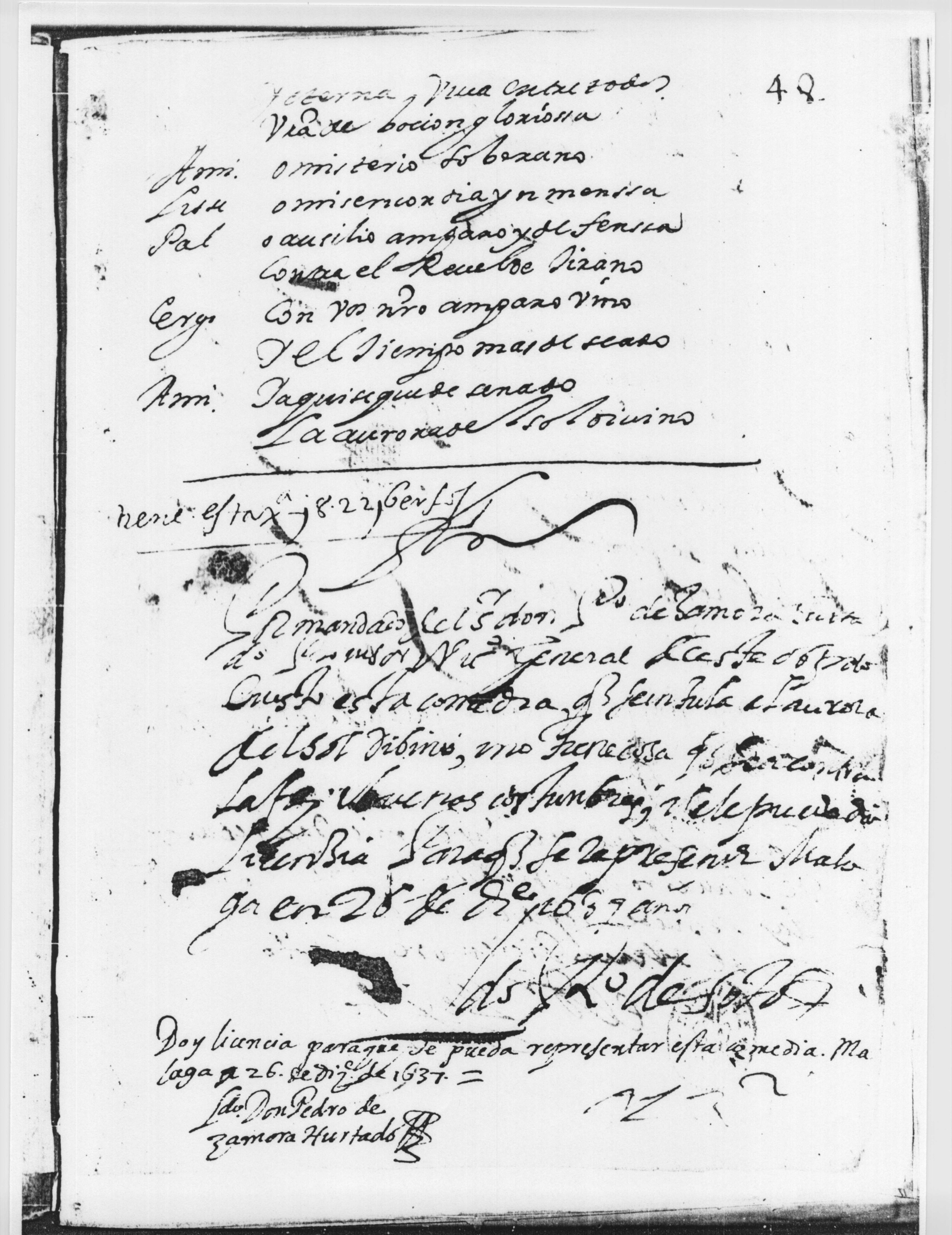 1) Ms. 1008, BNE 16.621, "La aurora del sol divino" 2) El ms. incluye licencias de representación fechadas en Málaga el 26/12/1637, en Madrid el 01/03/1640 y en Zaragoza el 28/12/1640. Sabemos que la compañía de Luis López Sustaete estuvo representando en Málaga en enero de 1638, por lo que es muy probable que la representación de diciembre de 1637 corriera a cargo de su compañía. Sabemos que la misma compañía estuvo en Madrid en febrero de 1640 y en Valencia en octubre de 1640, por lo que es probable que las licencias de representación de este año también estén relacionadas con su compañía, aunque no dispongamos de datos que permitan corroborarlo con mayor seguridad |