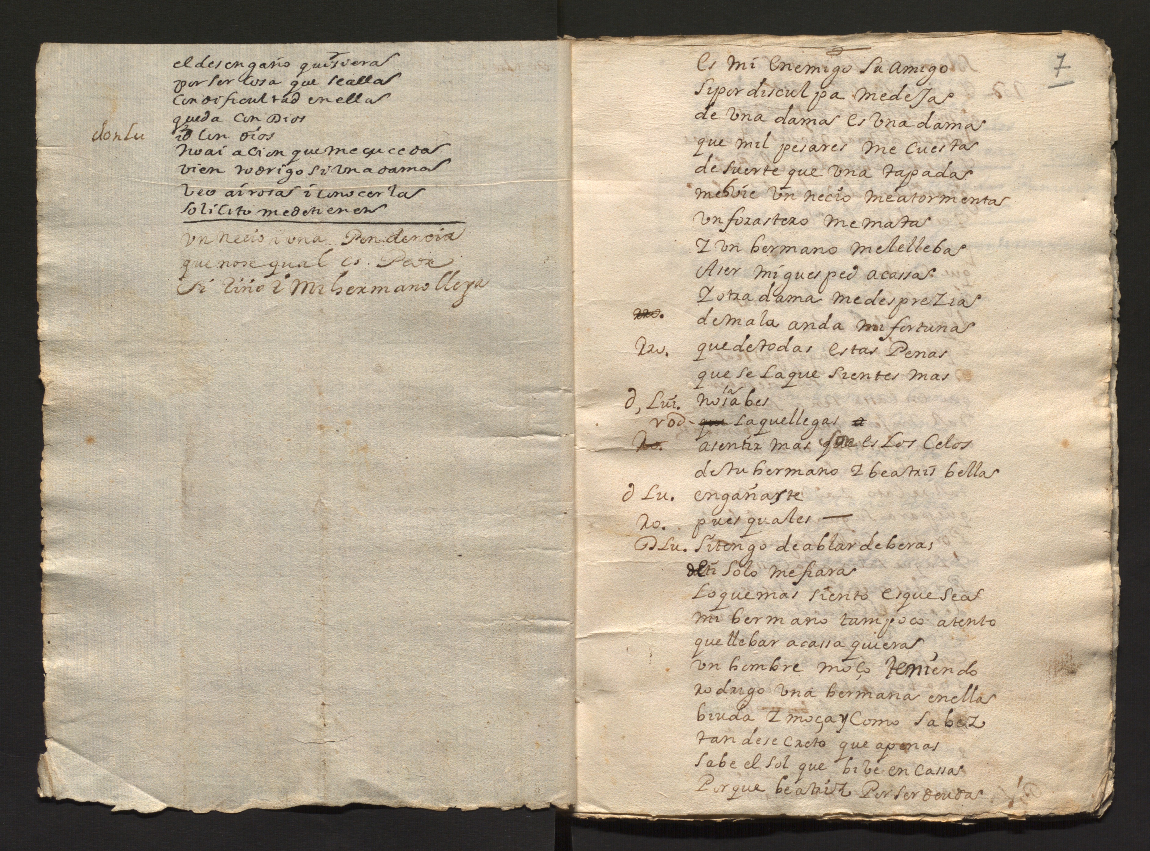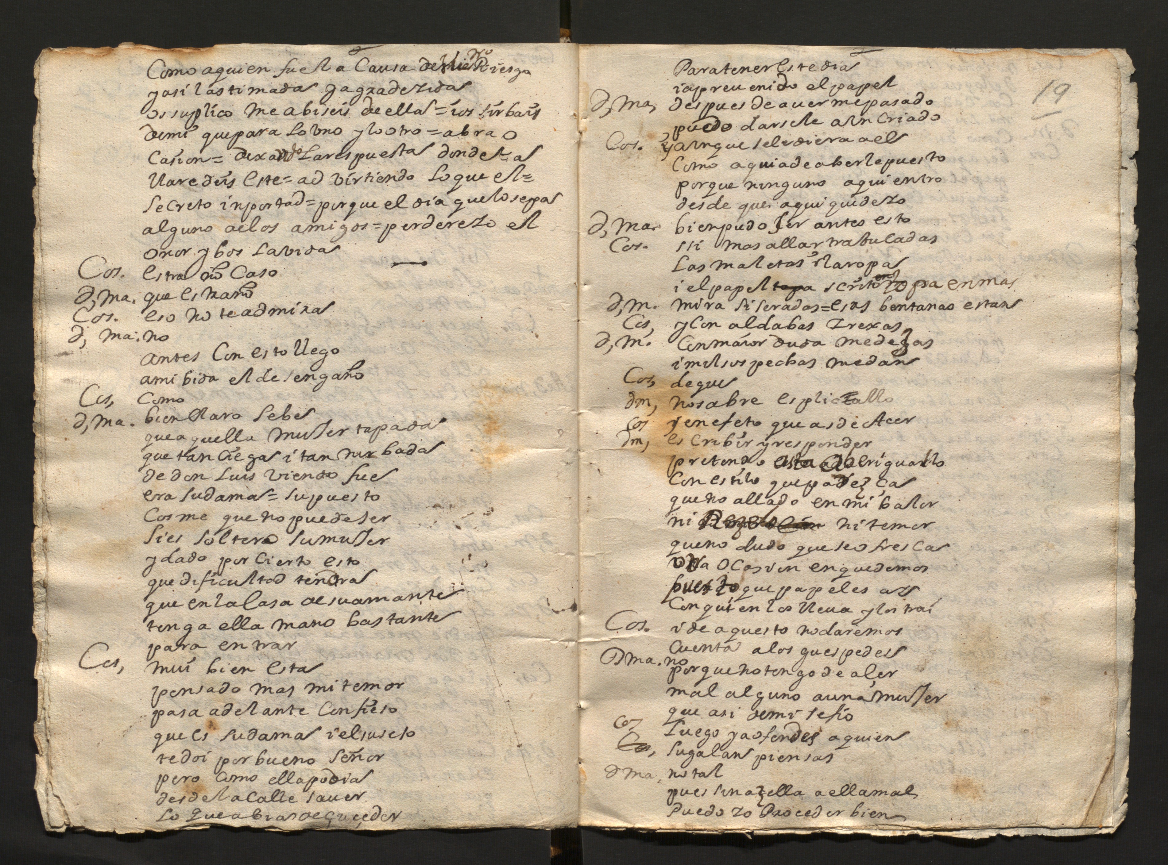 Notas: 1) 50 hojas 2) Al principio de la jornada III aparecen los nombres de Antonio de Escamilla y de Miguel de Escamilla, lugar de la copia (Lisboa) y fecha (01/12/1689): "Soy de Antonio de Escamilla" "Se sacó en Lisboa a 1 de diciembre / M[i]g[ue]l de Escamilla año de 1689" 3) Las jornadas II y III parecen ser copias bastante limpias; enmiendas y tachaduras menores en jornada I; acotaciones en los márgenes y/o cuerpo central del folio en todas las jornadas 4) Al final de la jornada I, aparecen pruebas de escritura en tinta más clara 5) f.1r: entre la lista de personajes y la primera acotación, Antonio de Escamilla (C004) ha escrito: "ase de sacar a don Luis para Malagilla / ase d sacar? Don luis" - ver Ruano, "Two scribes". |