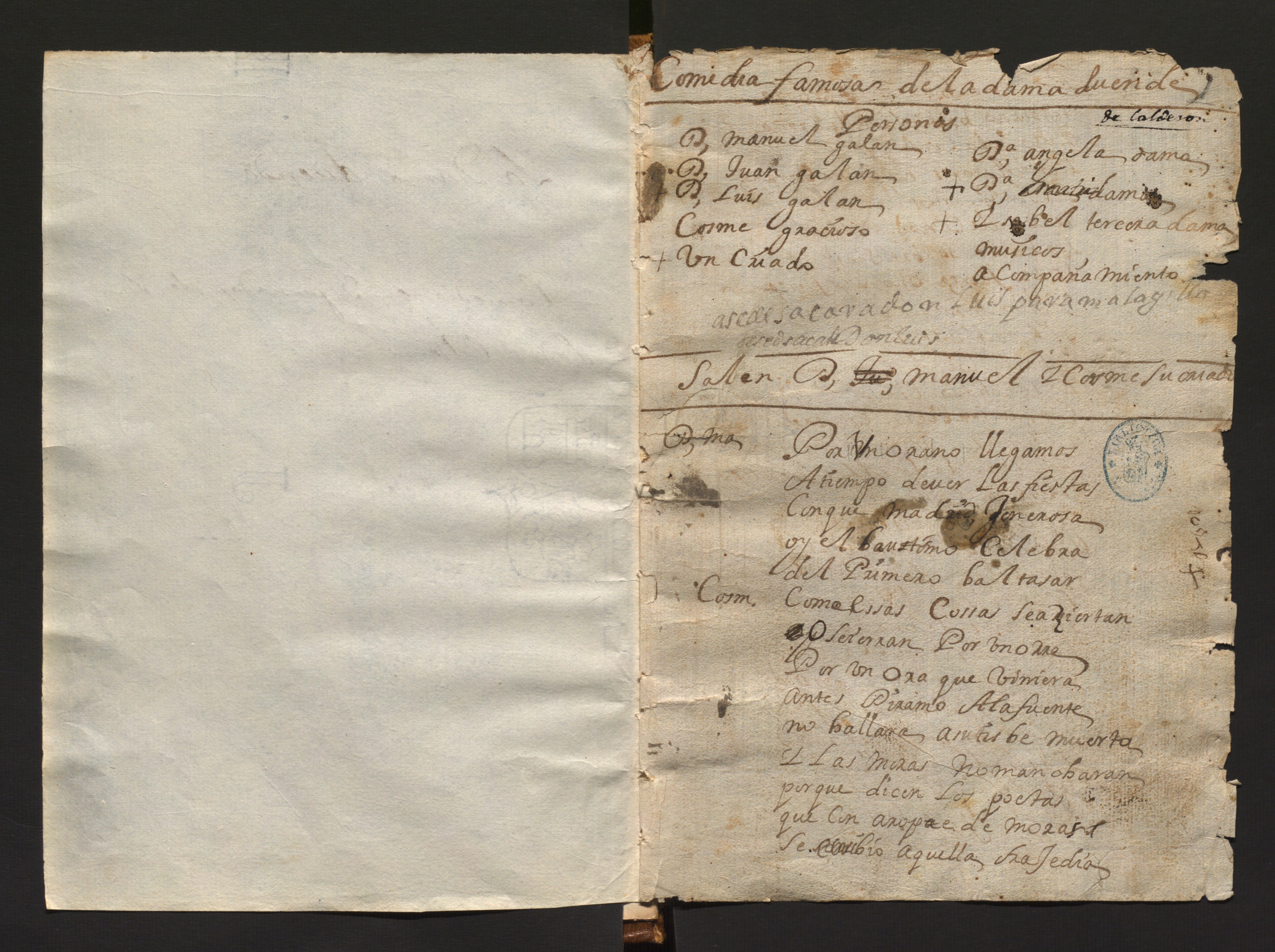 1) Ms. 1058, BNE 16.622, "La dama duende" 2) A continuación del elenco de personajes que se incluye al principio del f.1r una mano distinta a la que copia este folio ha añadido la siguiente anotación: "ase de sacar a don Luis para Malaguilla". Es decir, que había que sacar copia del papel de "don Luis" para que el actor Malaguilla pudiera estudiarlo. El manuscrito perteneció a la compañía de Antonio de Escamilla y tenemos documentado en DICAT que Juan de Malaguilla Mendieta trabajó con este autor en diversas ocasiones entre 1663 y 1678. ¿Puede aludir esta nota a una representación hecha en torno a estas fechas? |