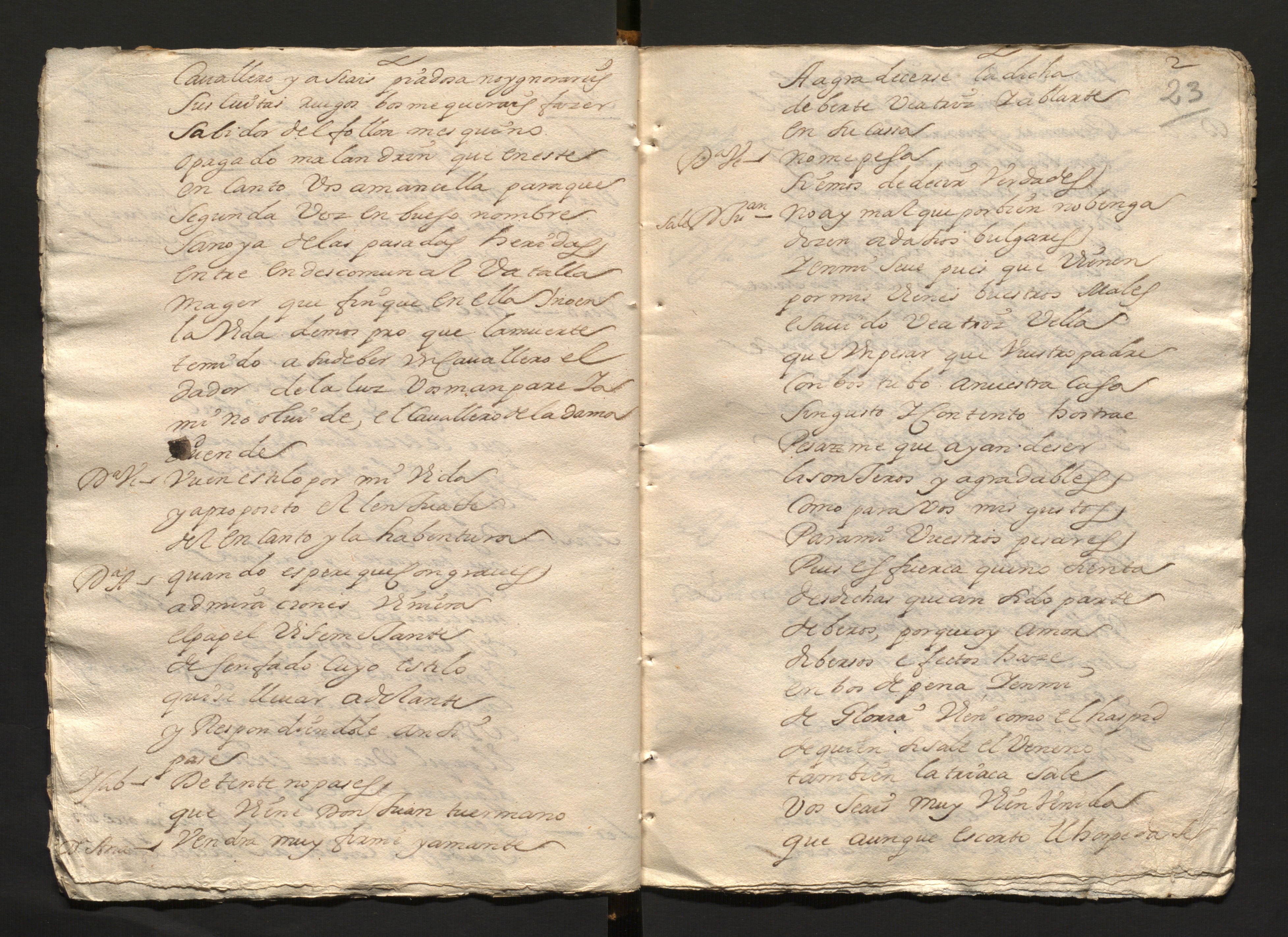 1) Ms. 1058, 16.622 (BNE), P. Calderón de la Barca, La dama duende 2) J. 2 y 3 3) Sus j's tienen los mismos rasgos que la j25, j31, pero a diferencia de éstas. están al mismo nivel que el resto de letras (que la línea) - MG - No comprendo esto; verificar 4) uso frecuente de la h: "habrirse", "habentura", "hospedaje", pero "ermano" 5) Escribe el nombre del personaje Beatriz con v. |