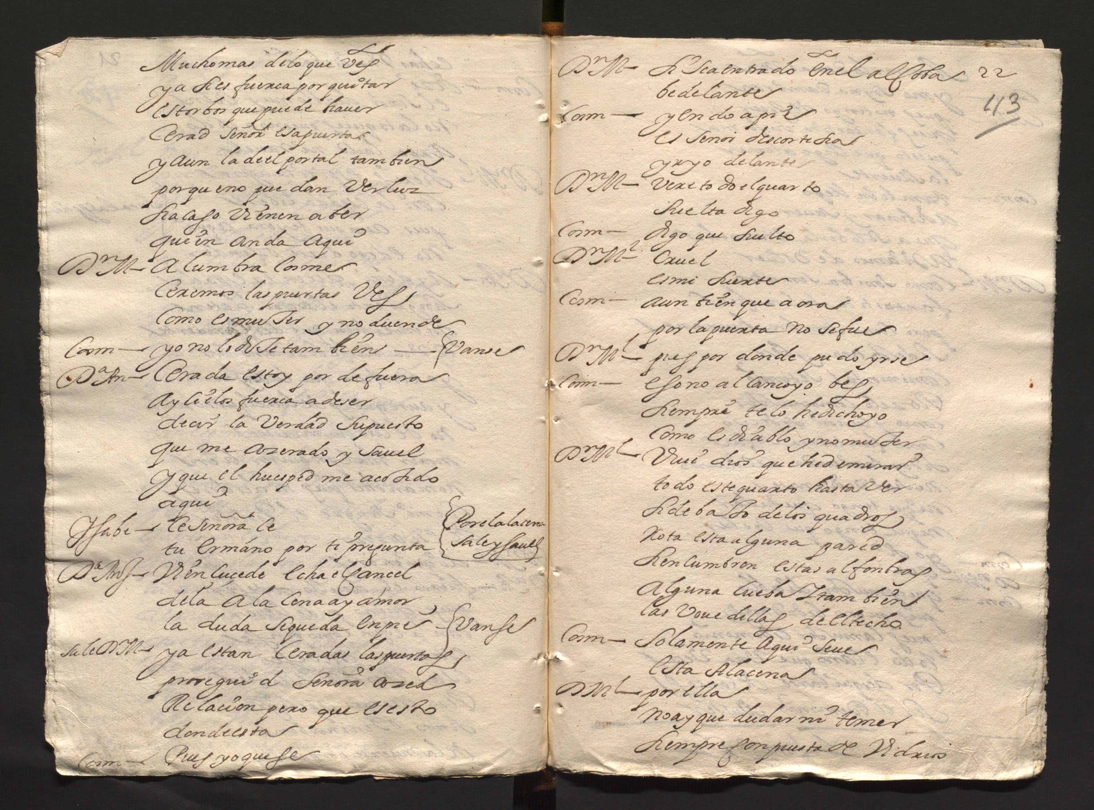1) Ms. 1058, 16.622 (BNE), P. Calderón de la Barca, La dama duende 2) J. I 3) La mano cambia bastante conforme sigue escribiendo. 4) Hace una pequeña vuelta hacia la izquierda o la derecha al iniciar el trazo alto de algunas letras, como la "b" o la "h" 5) "que" abreviado a principio de verso con un trazo como un "2" |