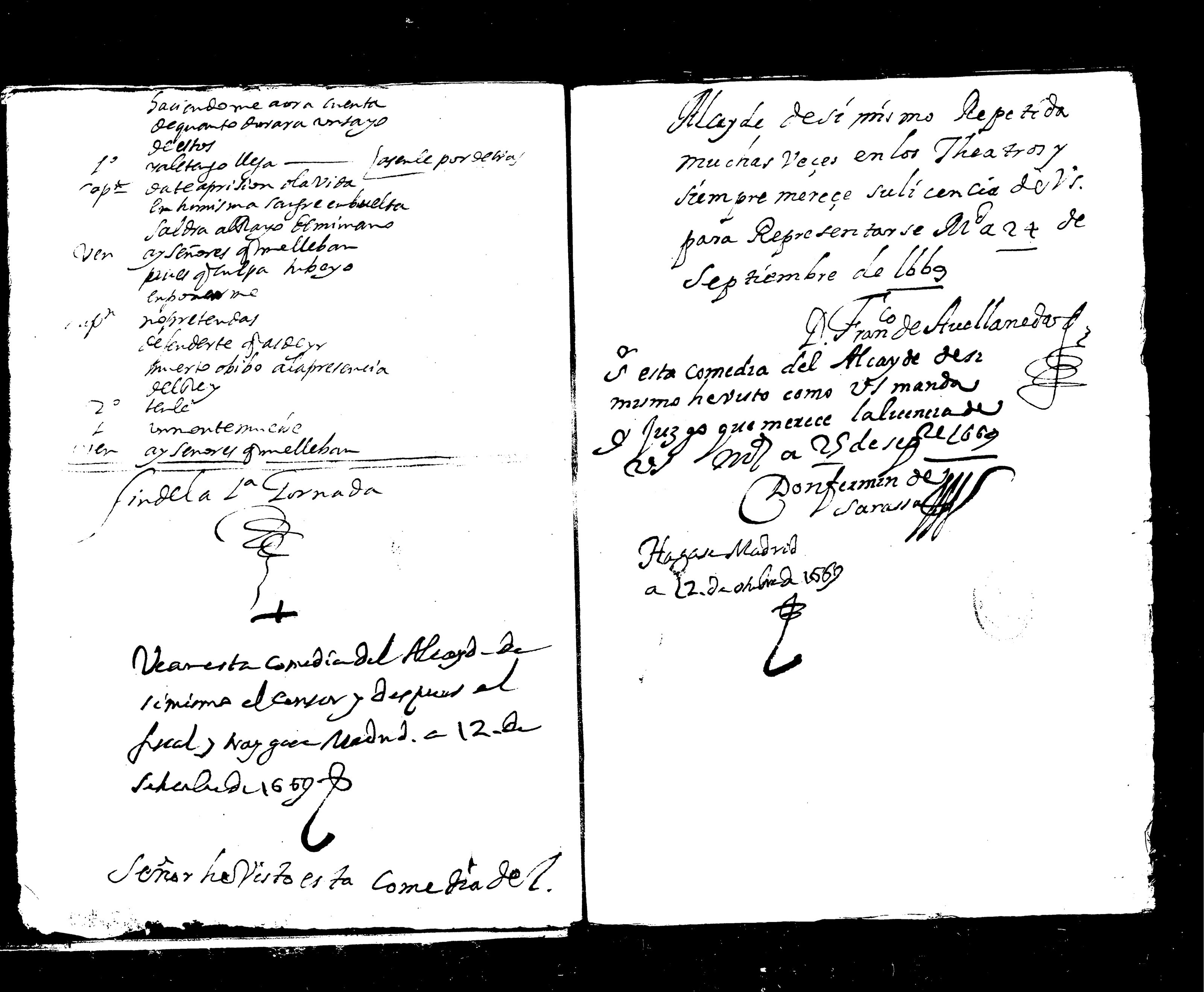 4) Al final de la I jornada (f.14v-f.15r) figura el siguiente texto: "Vean esta comedia del Alcayde de/ si mismo el censor y despues el fiscal y [ilegible] Madrid a 12 de setiembre de 1669 4a )/ Señor he visto esta comedia del Alcayde de si mismo repetida/ muchas veces en los theatros y siempre mereçe su licencia de/ Vs. para representarse en Madrid a 24 de/ Septiembre de 1669/ [Firmado] Don Francisco de Avellaneda/ 4b) esta comedia del Alcayde de si/ mismo he visto como Vs. manda/ y juzgo que merece la licencia de/ Vs. Madrid a 25 de septiembre de 1669/ [Firmado Don Fermin de Sarassa/ Hagase Madrid a 22 de octubre de 1669"