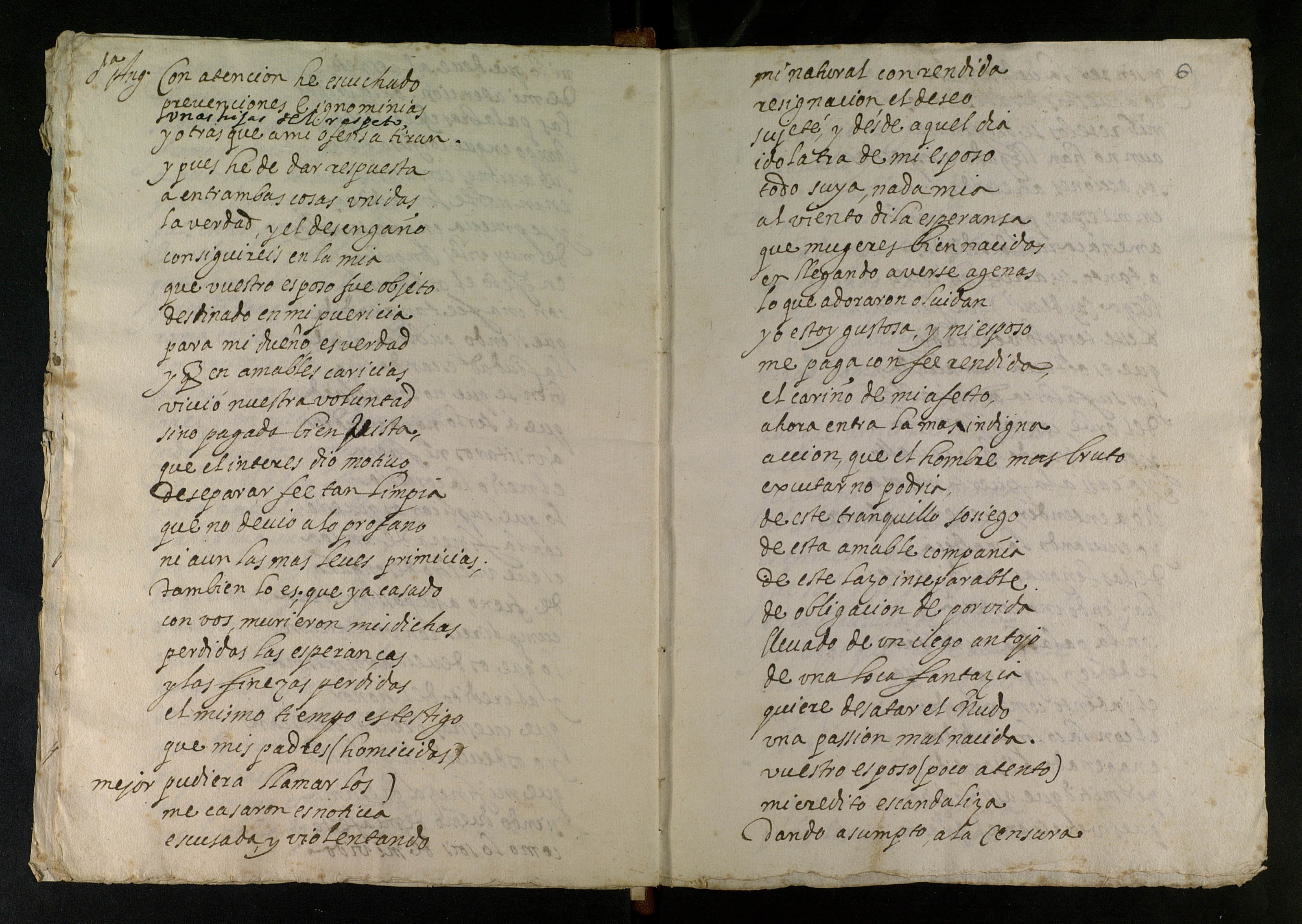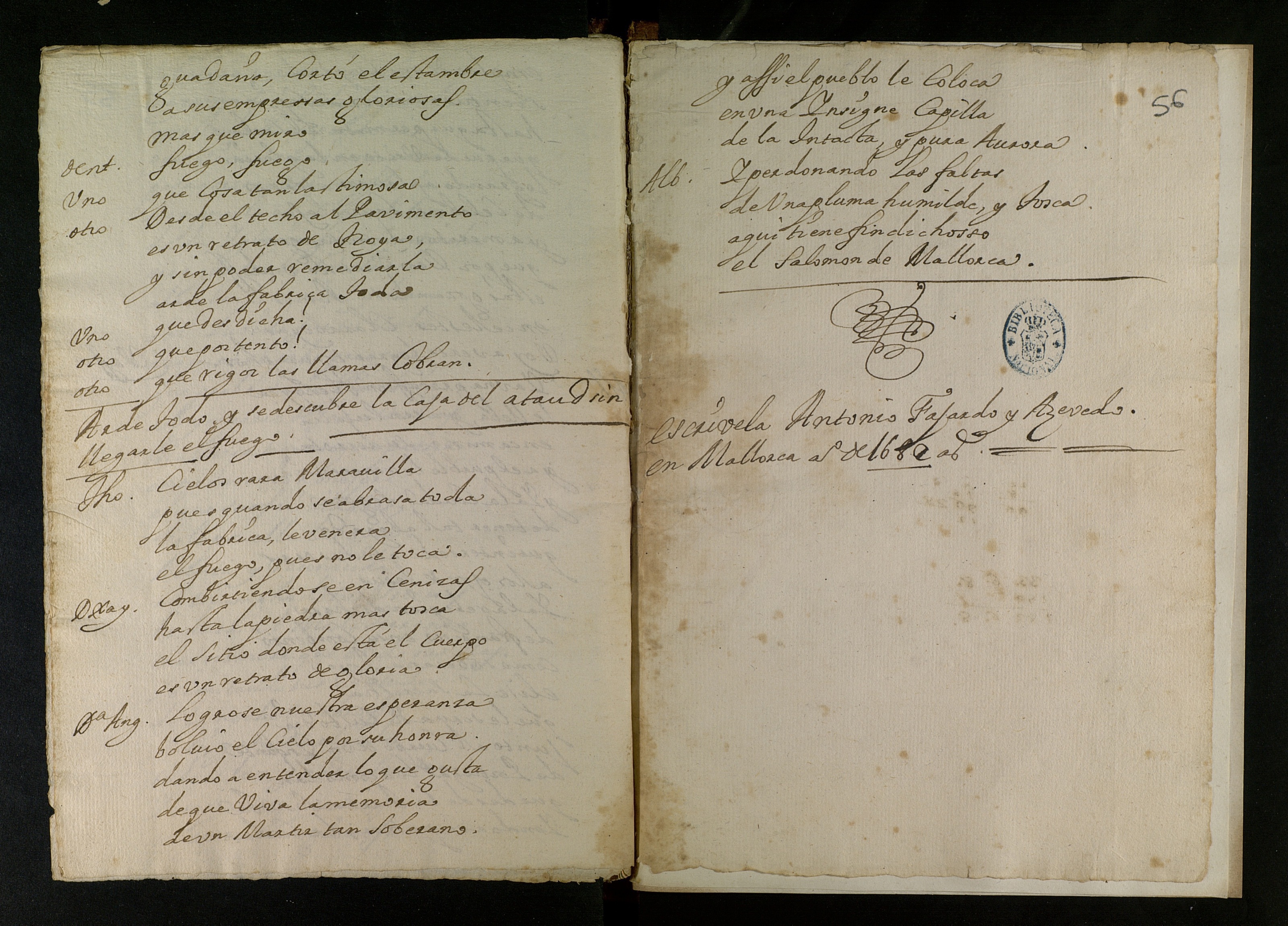 Folios de Muestra: Micro 8953, 63 fot. Digitalizaciones a 300 dpi pedidas 29/05/2013 de: Recibidas 25/06/2013 ff. 3v-4r: "Ang. no teniendo que embidiar...//...dio de su amor muestras finas" ff. 5v-6r: "Sª Ang. Con atencion he escuchado...//,,,dando asumpto a la censura" ff. 21v-22r: "Tho que ignorancia...//...de sus motibos la causa" ff. 55v-56r: "guardaña, cortó el estambre...//...en Mallorca aº de 1682 a.s" folios 3v-4r entrado en ManosID |