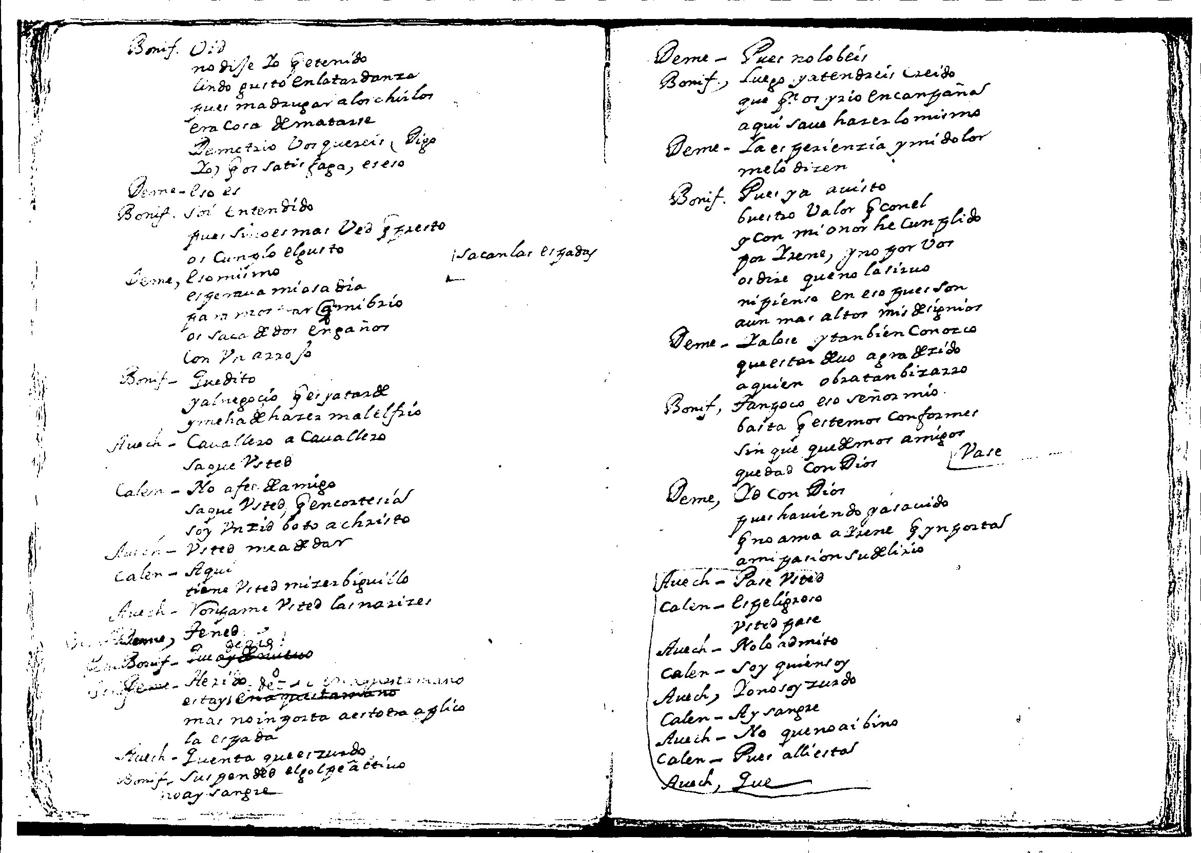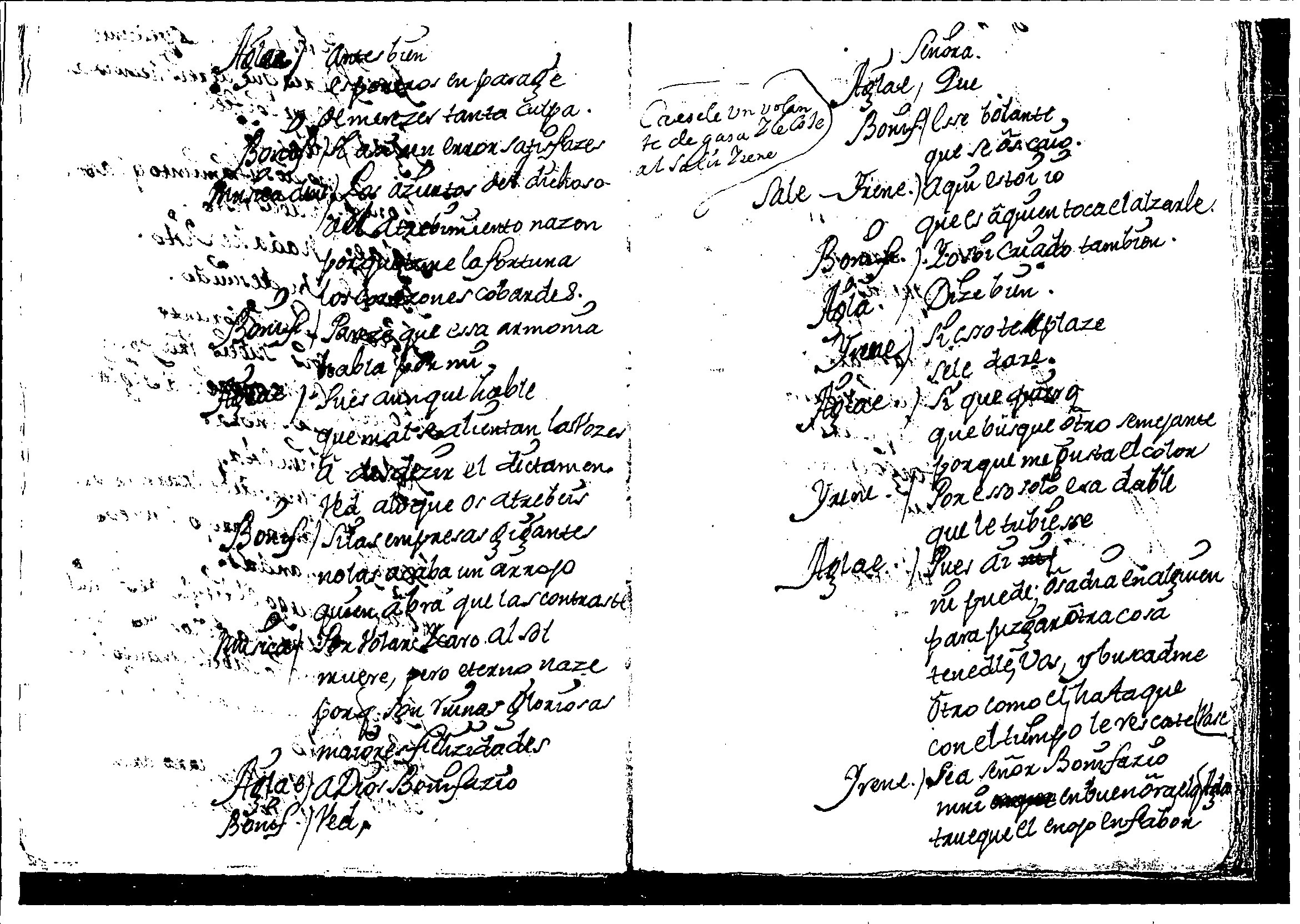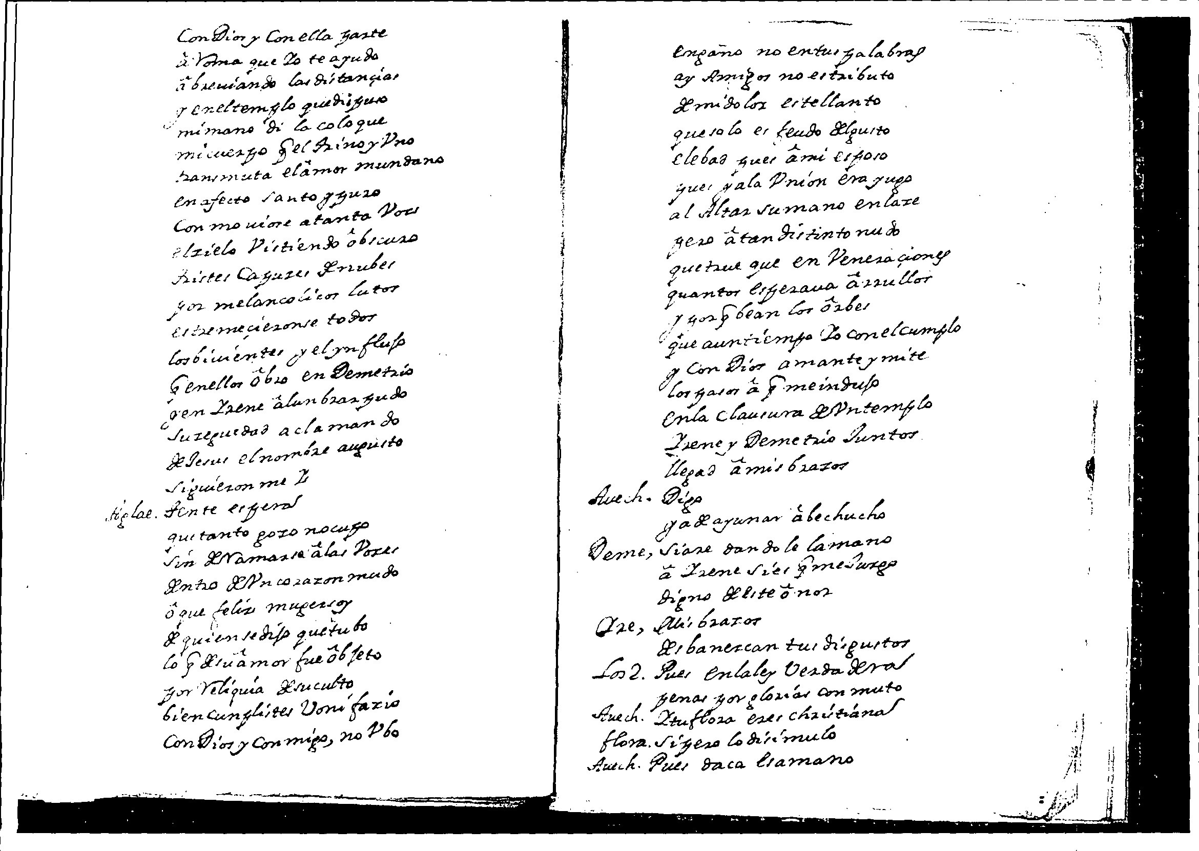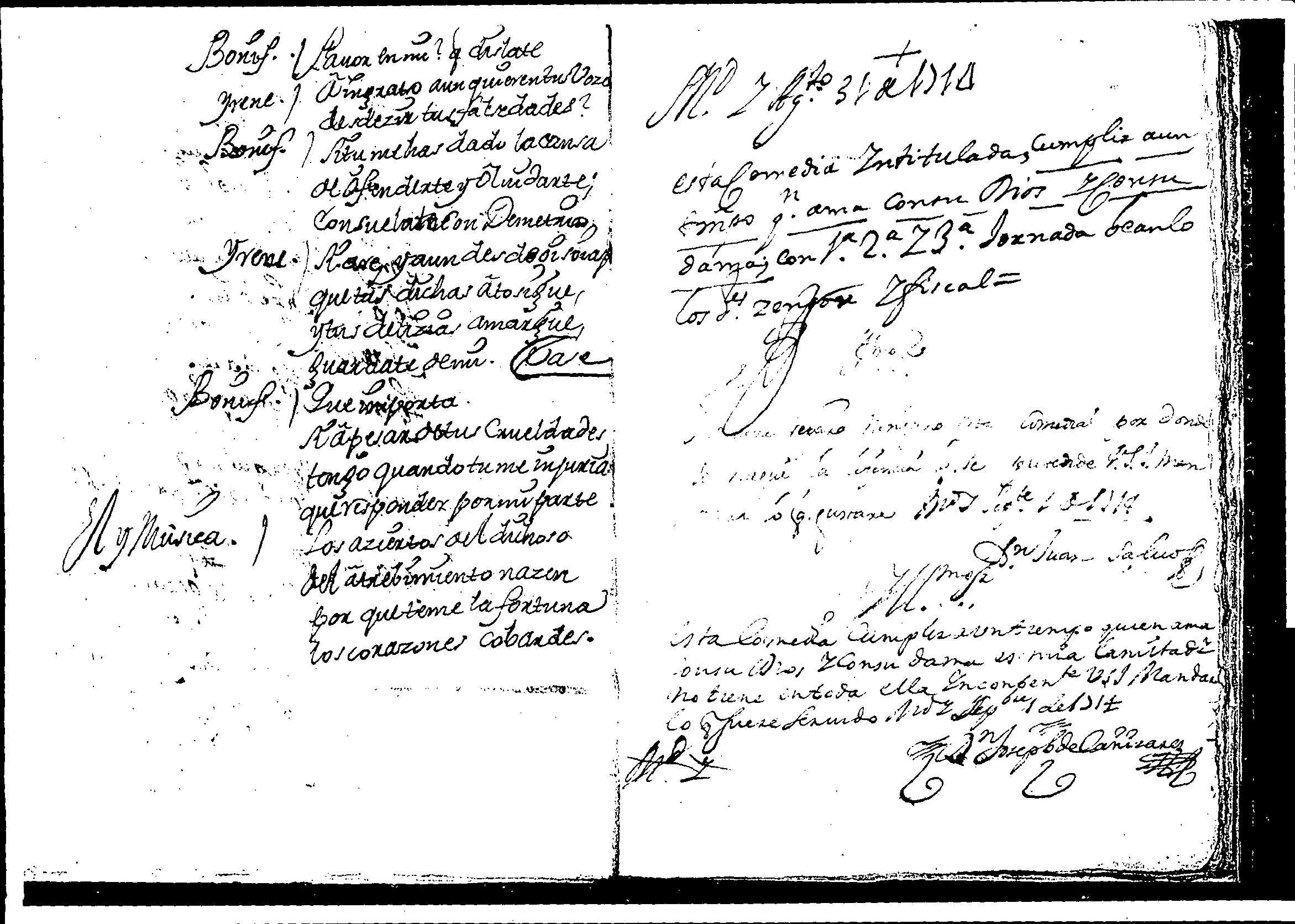 1) Ms. 1053, 16.965 (BNE), J. de Cañizares, Cumplir a un tiempo... 2) Jornadas 2 y 3 3) una cruz arriba de la jornada 4) acotaciones semiencajadas a la derecha 5) d y e entrelazadas 6) Z por c: felize, anunzio 7) Q 18- = el extremo inferior dobla en forma de pequño triángulo 8) R1- = mayúscula 9) Que 14- = la q y la u van unidas 10) V 12a- = bajan los dos trazos laterales 11) Y 28- = más larga en la parte inferior 12) MG - parece ser M034 por las formas, aunque la "f" es diferente |