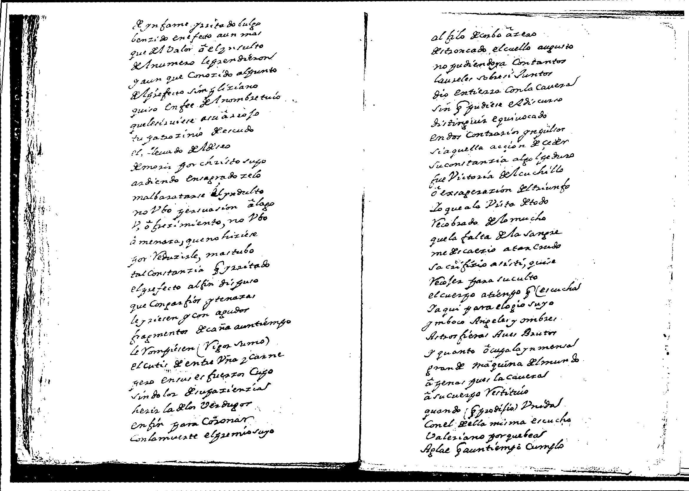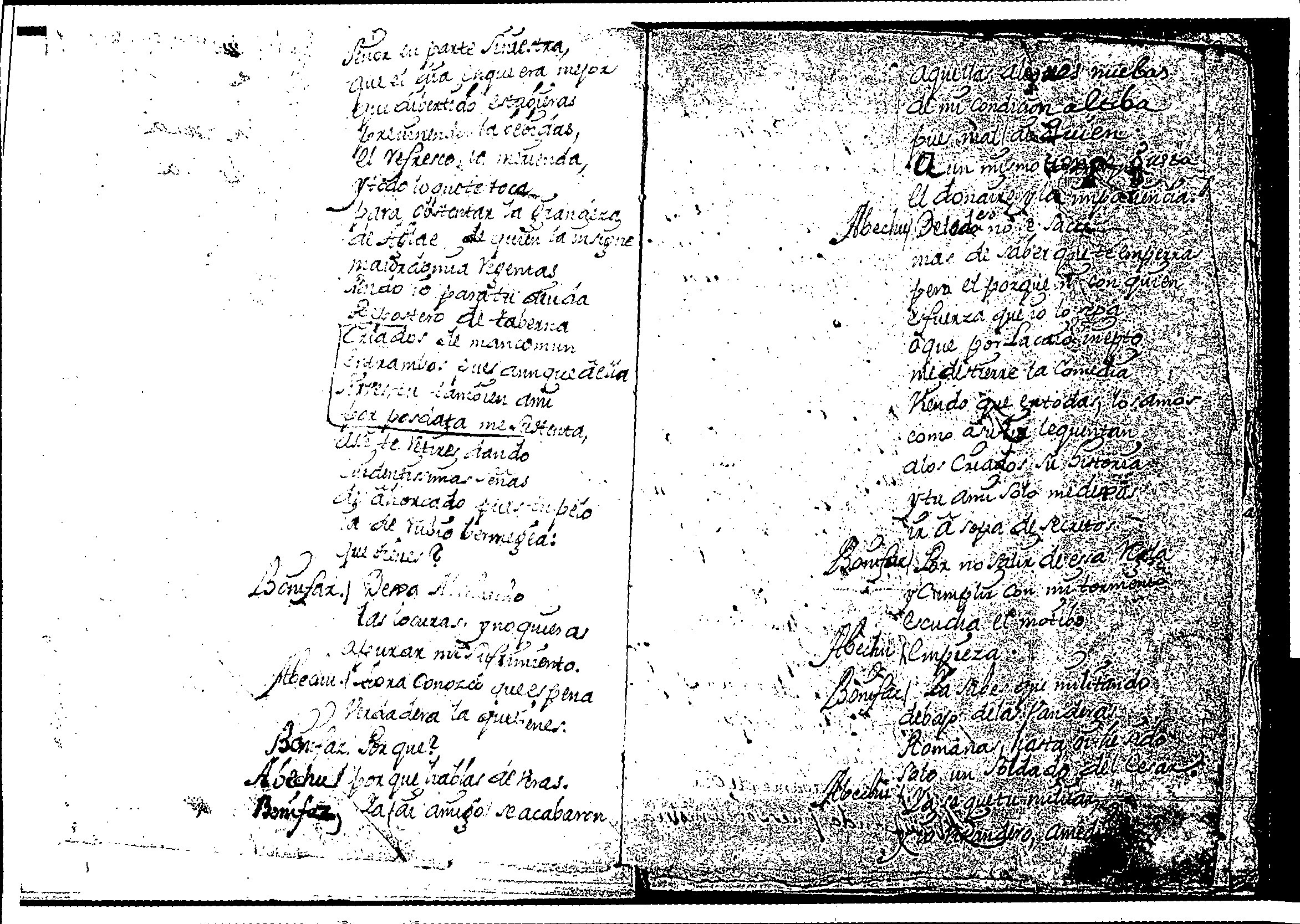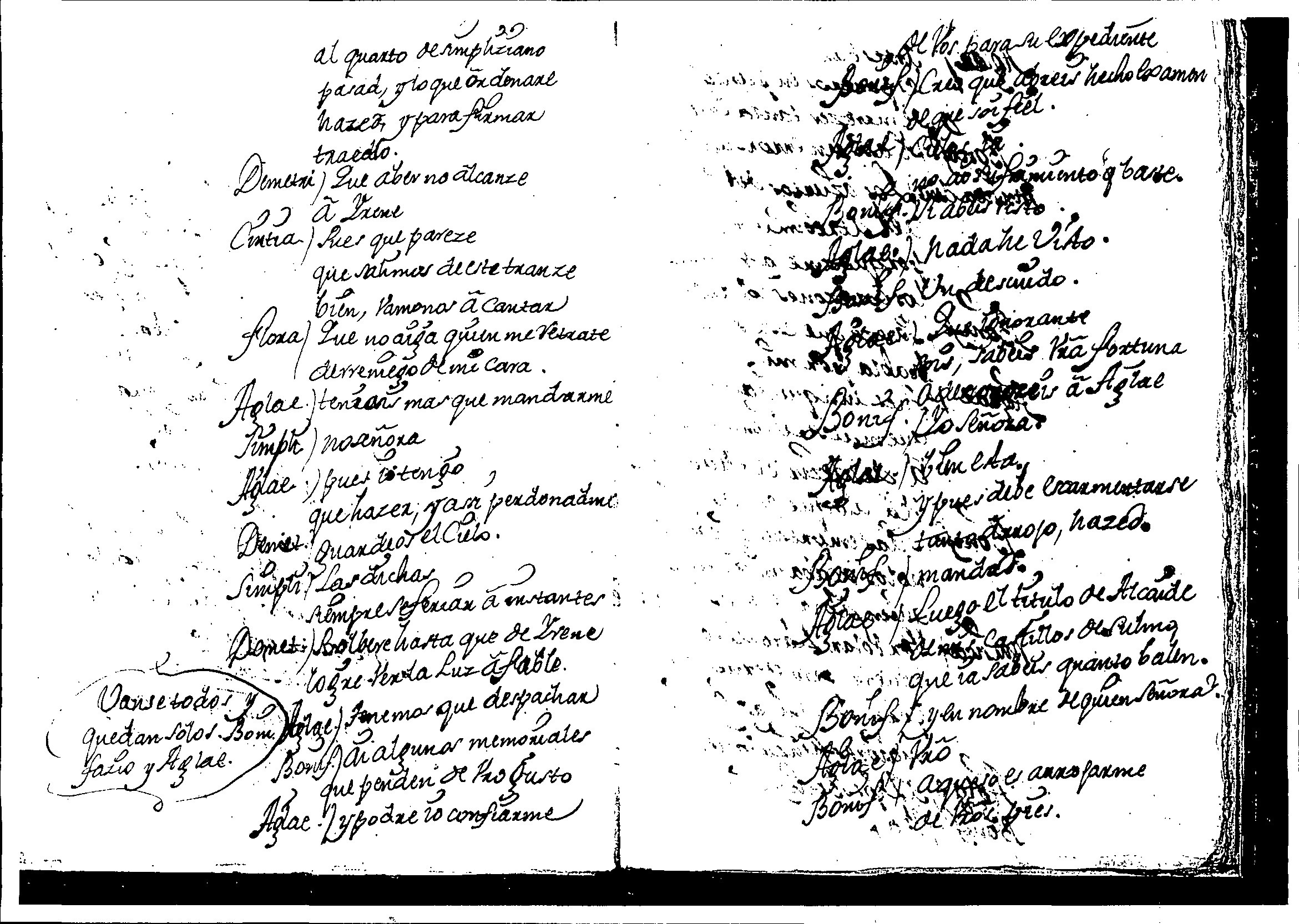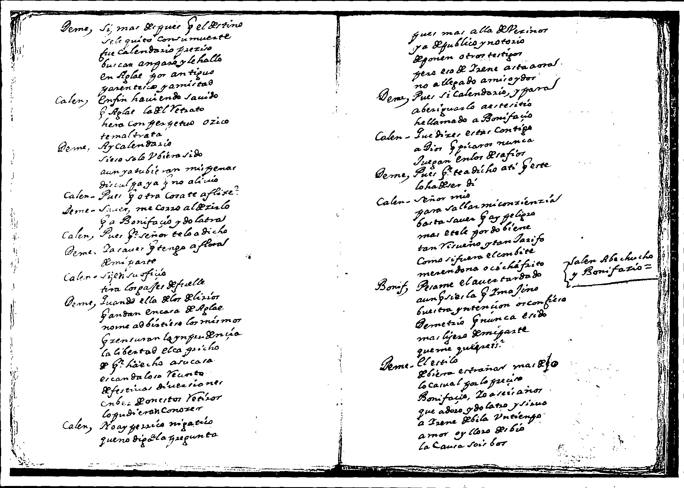 1) Ms. 1053, 16.965 (BNE), J. de Cañizares, Cumplir a un tiempo... 2) Jornadas 2 y 3 3) una cruz arriba de la jornada 4) acotaciones semiencajadas a la derecha 5) d y e entrelazadas 6) Z por c: felize, anunzio 7) Q 18- = el extremo inferior dobla en forma de pequño triángulo 8) R1- = mayúscula 9) Que 14- = la q y la u van unidas 10) V 12a- = bajan los dos trazos laterales 11) Y 28- = más larga en la parte inferior 12) MG - parece ser M034 por las formas, aunque la "f" es diferente |