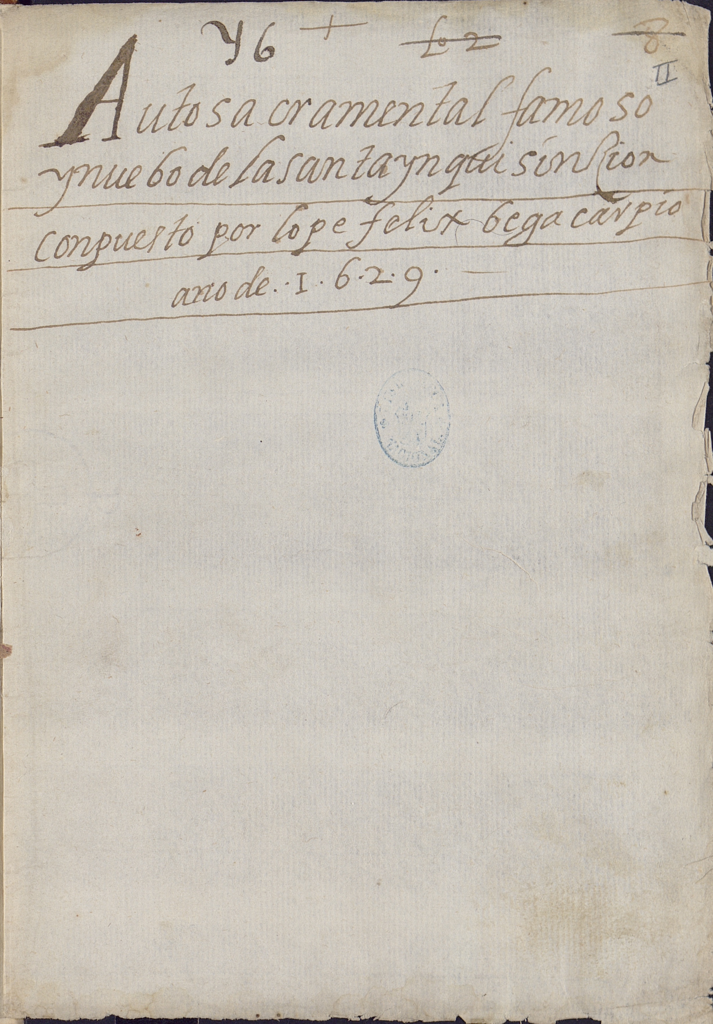 2) MG: En la portada, f.II: "Auto sacramental famoso | y nuebo de la santa ynquisizion | compuesto por Lope Felix Bega Carpio | año de 1629" y la atribución a Lope se repite en f. IIIr.