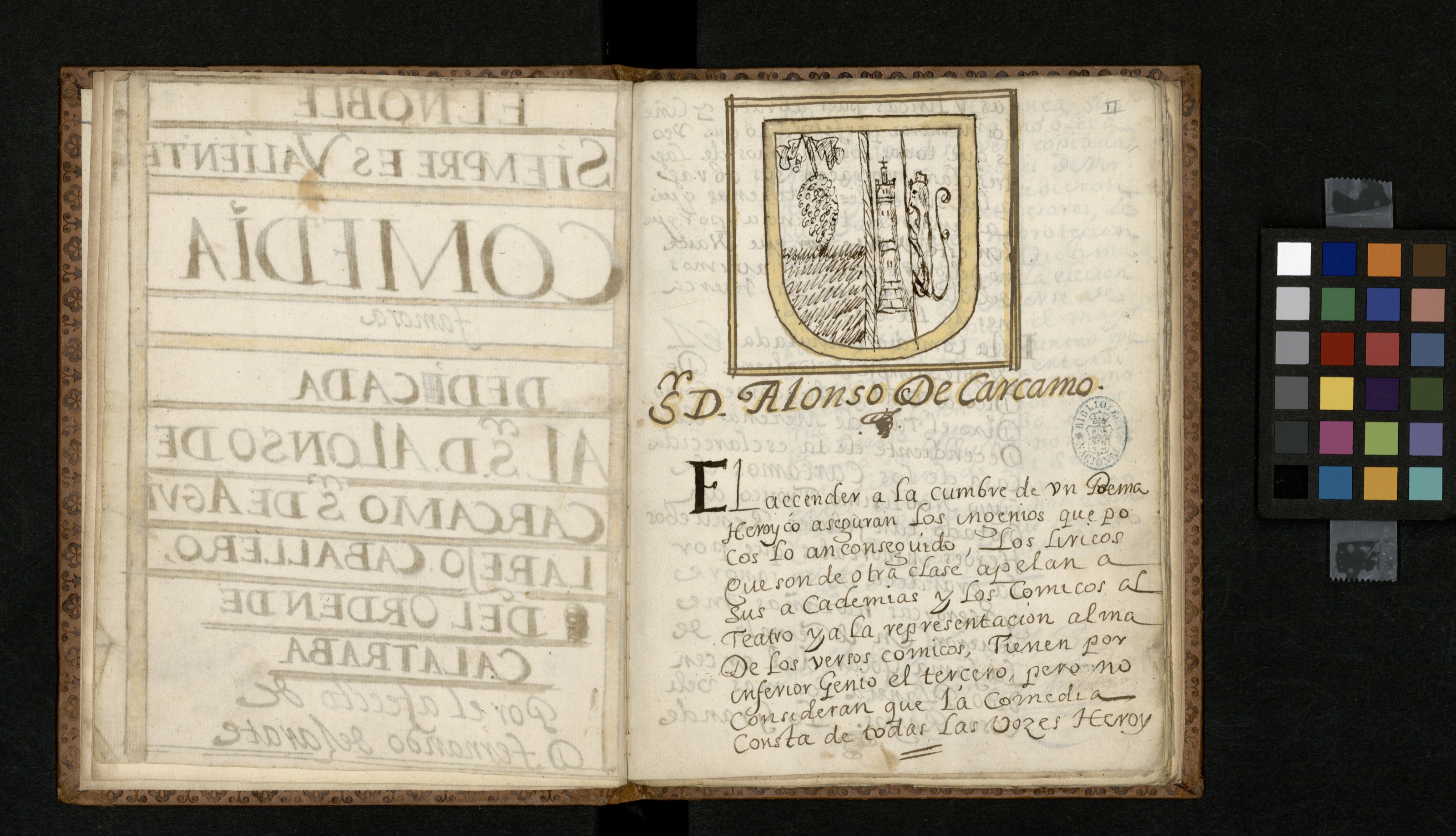 45 hojas; numerados I-IV, 1-41 Notas: 1) PM: autógrafa y con firma. Dedicatoria a d. Alonso de Carcamo 2) Escrito con el pseudónimo Fernando de Zárate y Castronovo. MG No vemos más que el nombre de Fernando de Zárate 3) f. I (portada 1): "El noble siempre ese valiente" | Comedia | famosa | dedicada | al Sr. D. Alonso de | Carcamo, Señor de Agui | larejo, Caballero | del orden de | Calatraba | Por el afeccto de | D. Fernando de Zarate 4) f. IIv-IIIr: Dibujo de un escudo, seguido por la dedicación al Sr. D. Alonso de Carcamo en prosa; al final, el lugar y fecha: Seuilla, 5 de abril de 1660 seguido por la firma: de Vmd qB S, M, B | 5) f. IV (portada 2) El título de nuevo, escrita "El noble sienpre es baliente" el nombre del autor, y la lista de personas. Parece que otra mano ha entrado en algún momento posterior las personas Celinda, Laín, Alí, y Arlaxa. La lista de los mismos también aparece al dorso, f. IVv 6) Nos parece que la mano cambia; que los folios 1r-9r podrían ser de la misma mano que escribió las portadas y la dedicación; y que otra mano escribe los folios 9v-41r 7) Otra(s) mano(s) han entrado trozos adicionales o alteraciones en los folios 8v, 24v, 27r, 36r, y en 38r; indicaciones de movimientos escénicos y "tocan" en otros folios; se han enjaulado muchos pasajes con un "Si" o "no" al lado. La segunda mano parece haber insertado otra línea entre líneas en f. 29v en una revisión del texto, y tal vez unas líneas en la margen izquierda en f. 31r |