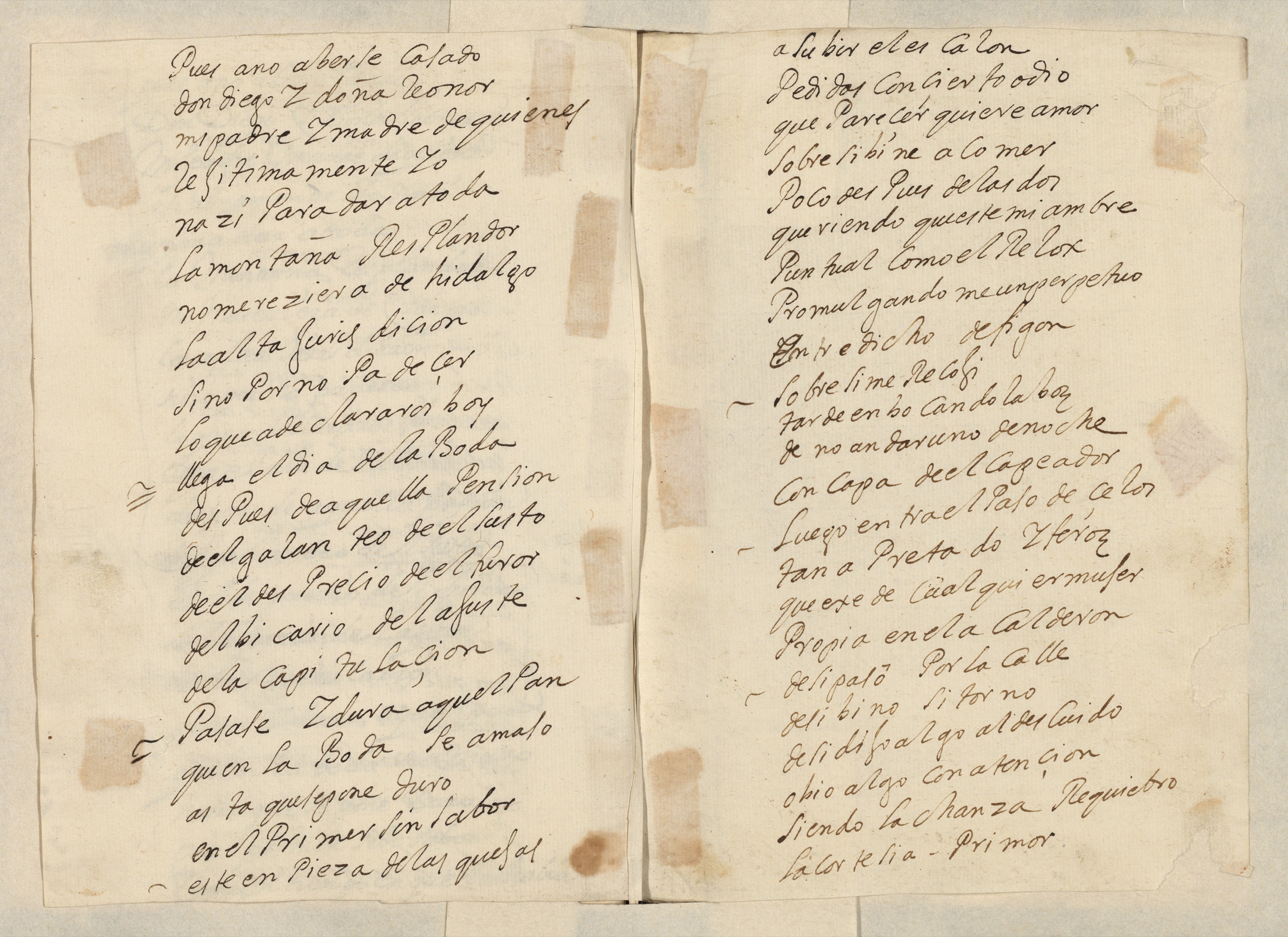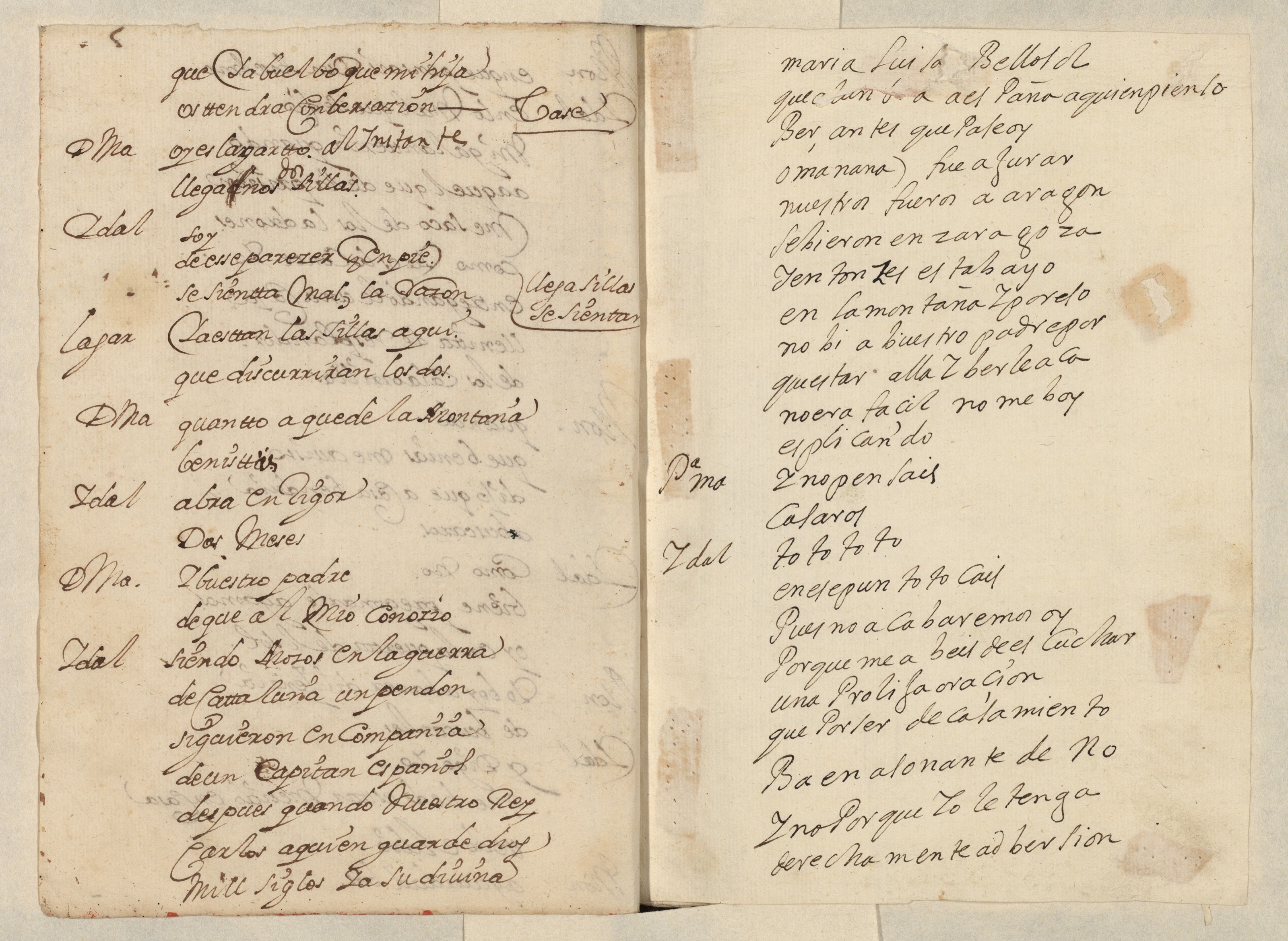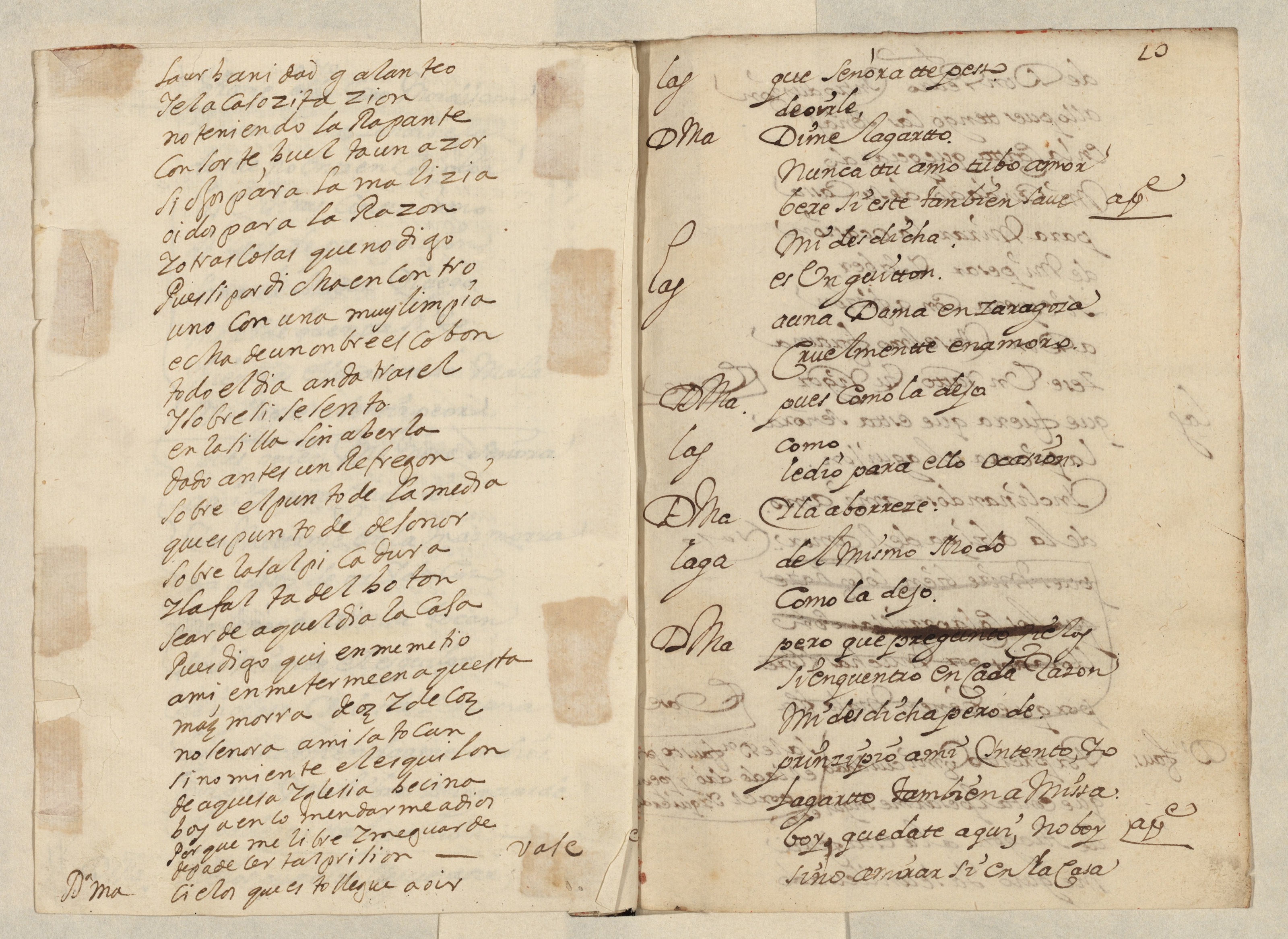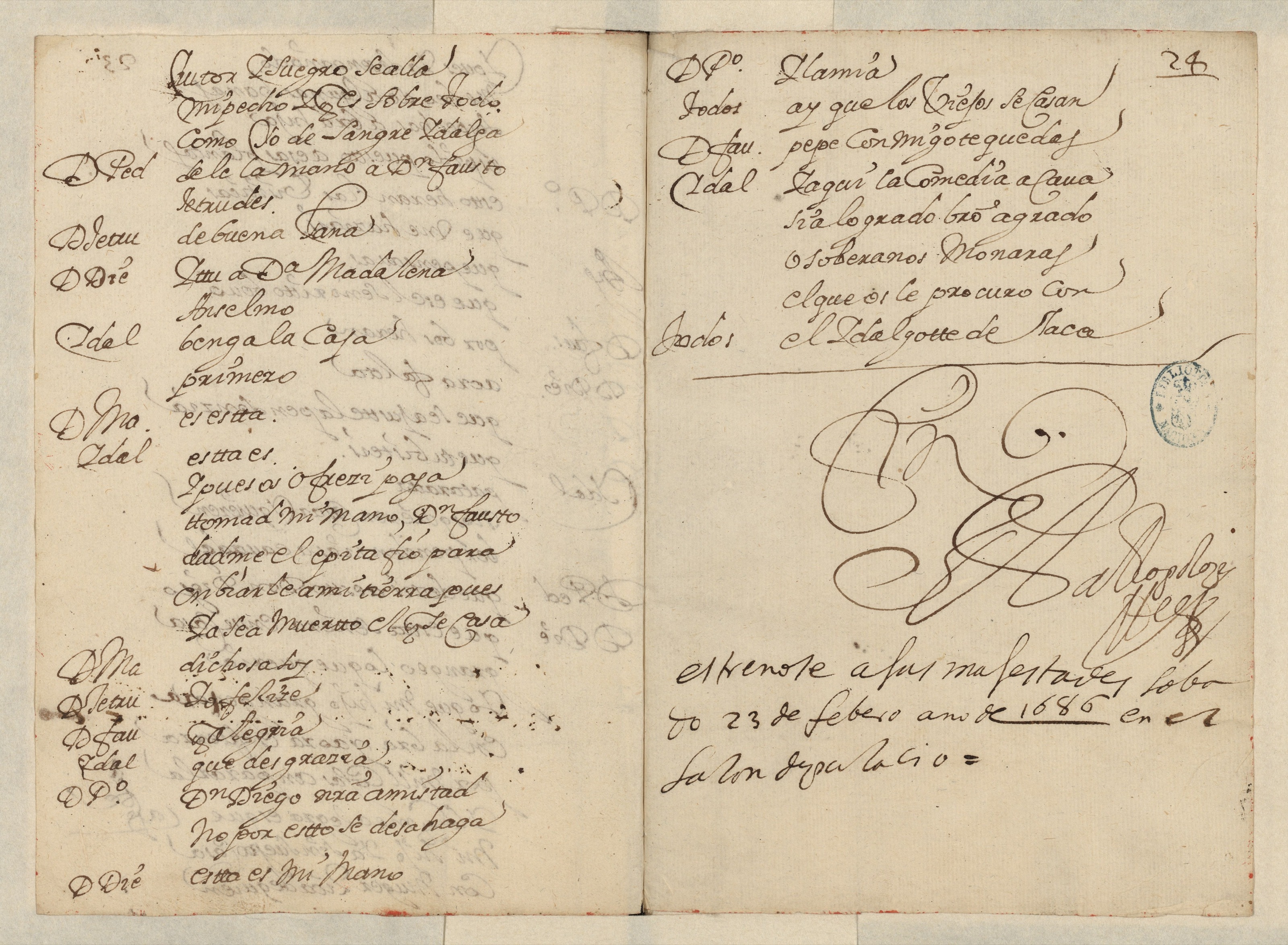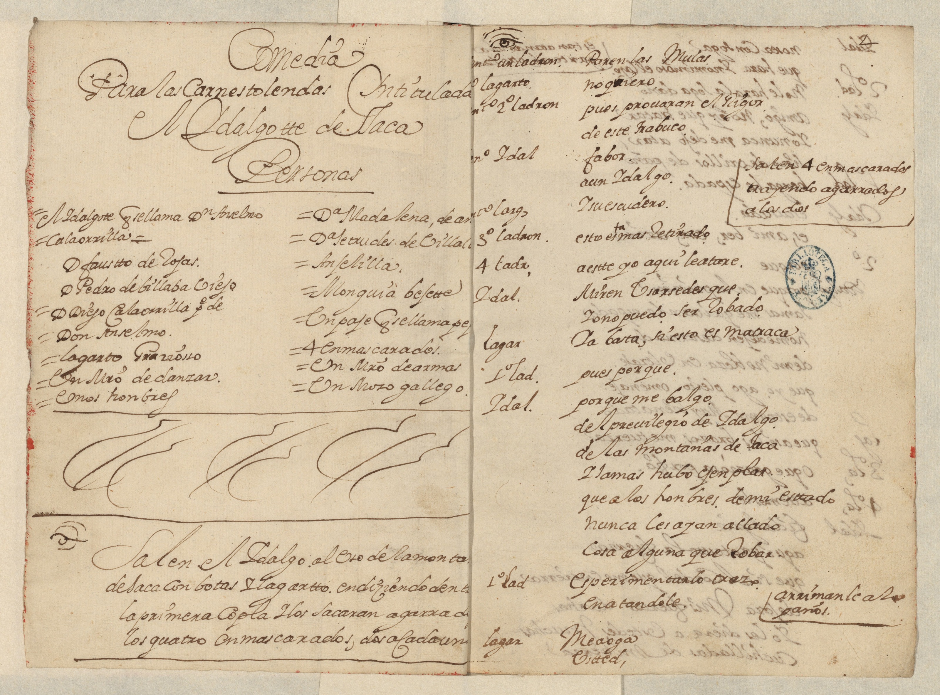 79 hojas. (Foliado de manera continua después de la digitalización de algunas de las imágenes, que puede reflejar la numeración original por jornadas) 1) PM: Comedia para las Carnestolendas, de don Pablo de Polop y Valdes; letra del s. XVII; 2) PM: Al fin: firma y rúbrica. De otra mano: "Estrenóse a sus majestades, sábado 23 de febrero de 1686, en el salón de Palacio". 3) PM: "La Barrera trae curiosa noticia biográfica en sus adiciones manuscritas, aunque sin citar entre sus obras esta comedia" 4) MG: Una copia en limpio, con unas correcciones mínimas con una tinta más oscura, en una segunda lectura; una de particular interés es el cambio de la fecha en una carta leída por doña Madalena, ff. 18r-v, en que se ha cambiado la fecha de 20/05/1684 a 1686, en año notado en f. 79r como el del estreno. Parece ser de otras manos un pasaje añadido en la margen en el f. 17r, otra en el f. 77v, una acotación en f. 21v, otra en 65v, una línea alterada f. 26r, con el dibujo de un ojo, Se ha enmendado un pasaje, pegando otras hojas sobre la original - ff. 34r-35v, y 37v |