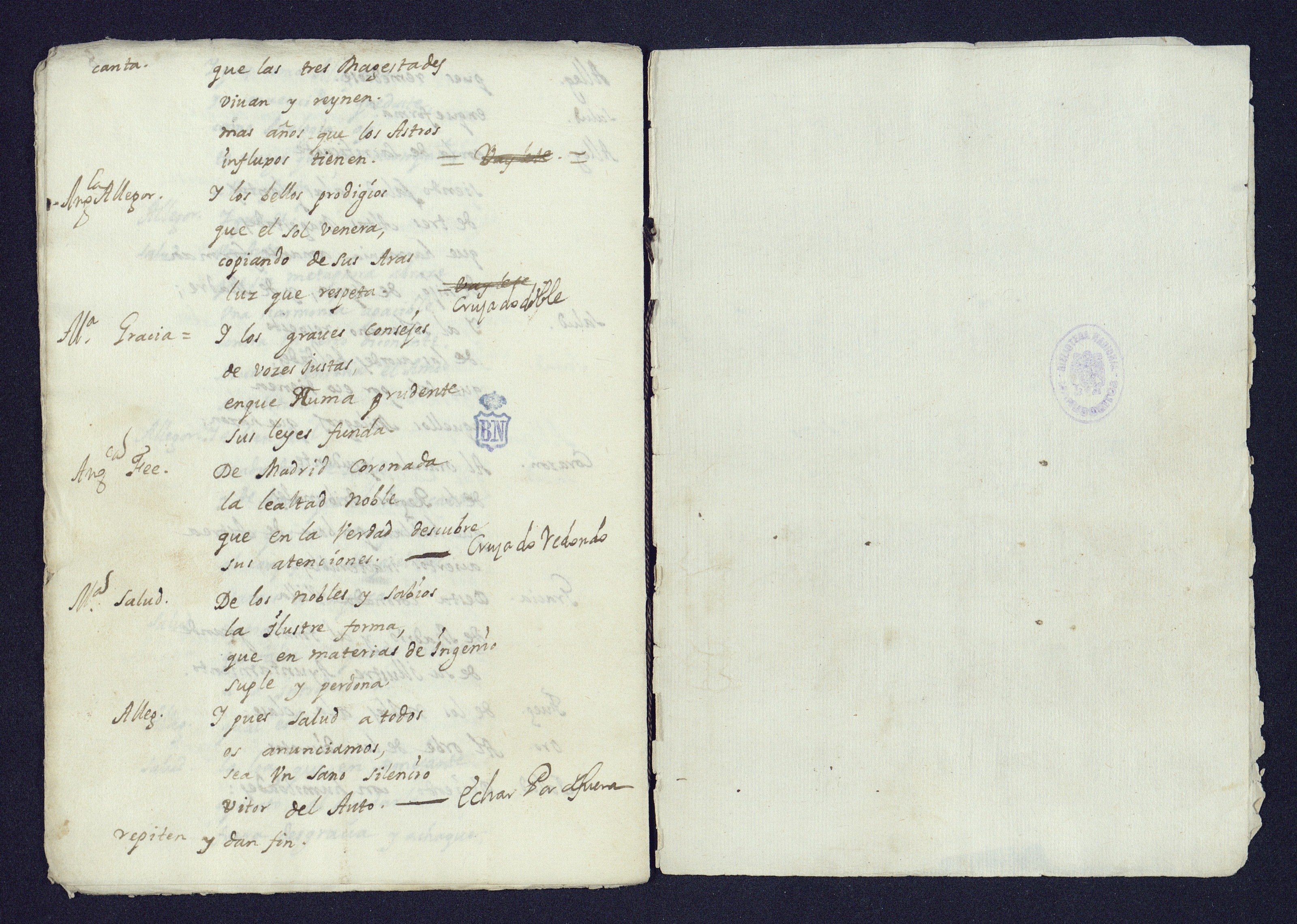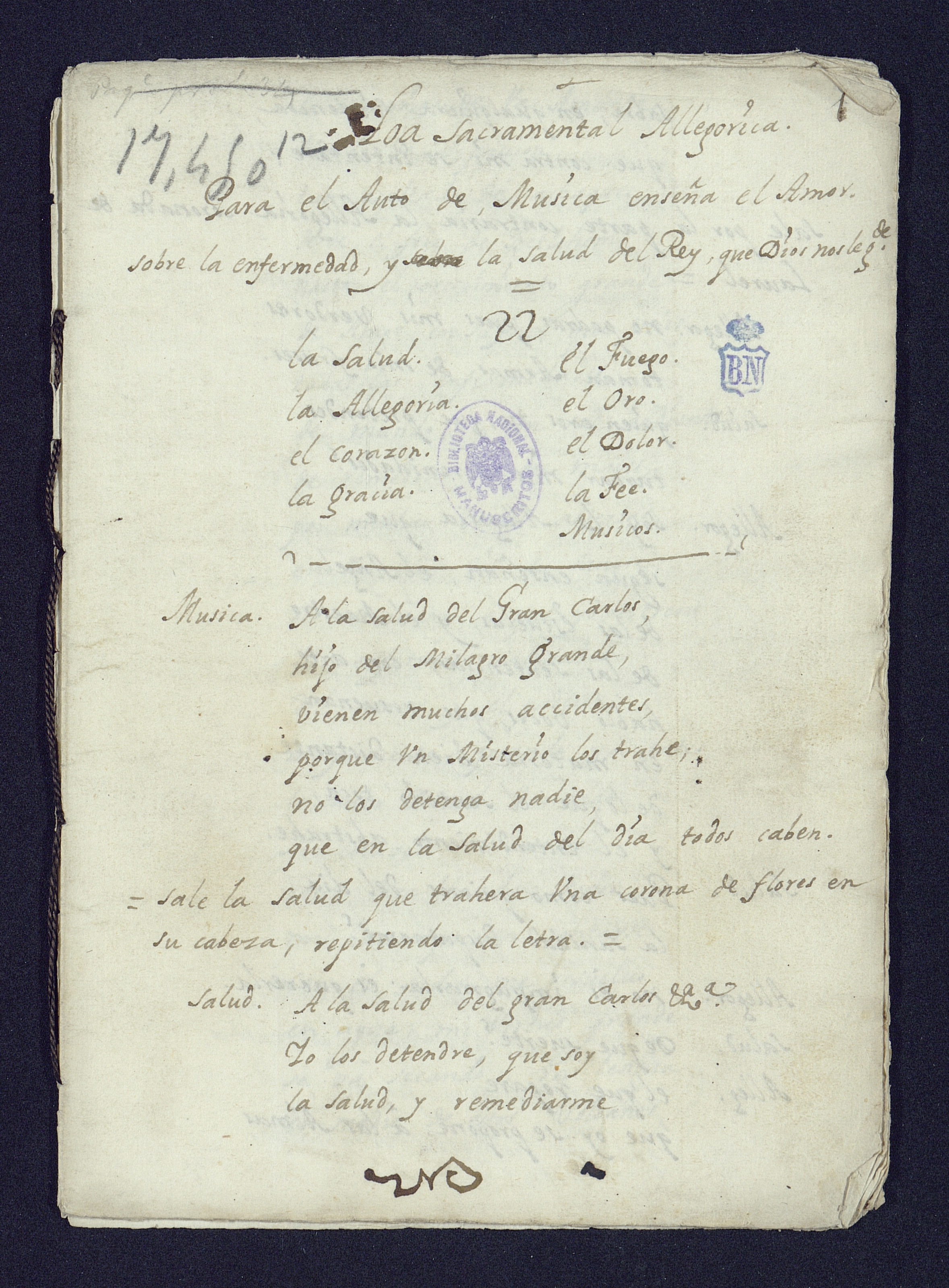 Ms. 4905, BNE 17.450 12, "Loa sobre la salud del rey" para el auto de "Música enseña el amor" de 1693, para la compañía de Agustin Manuel Ortografía muy parecida al uso moderno |