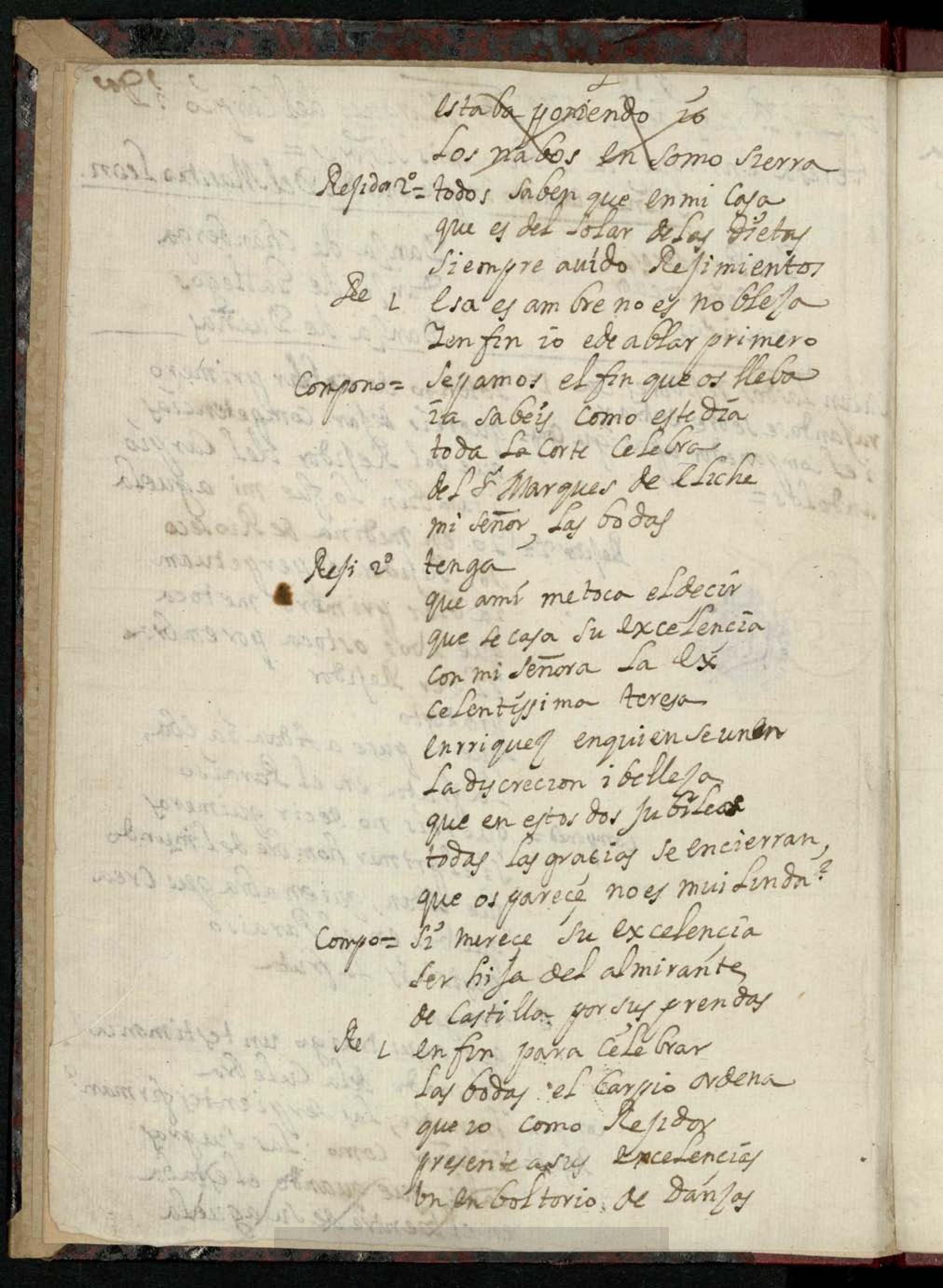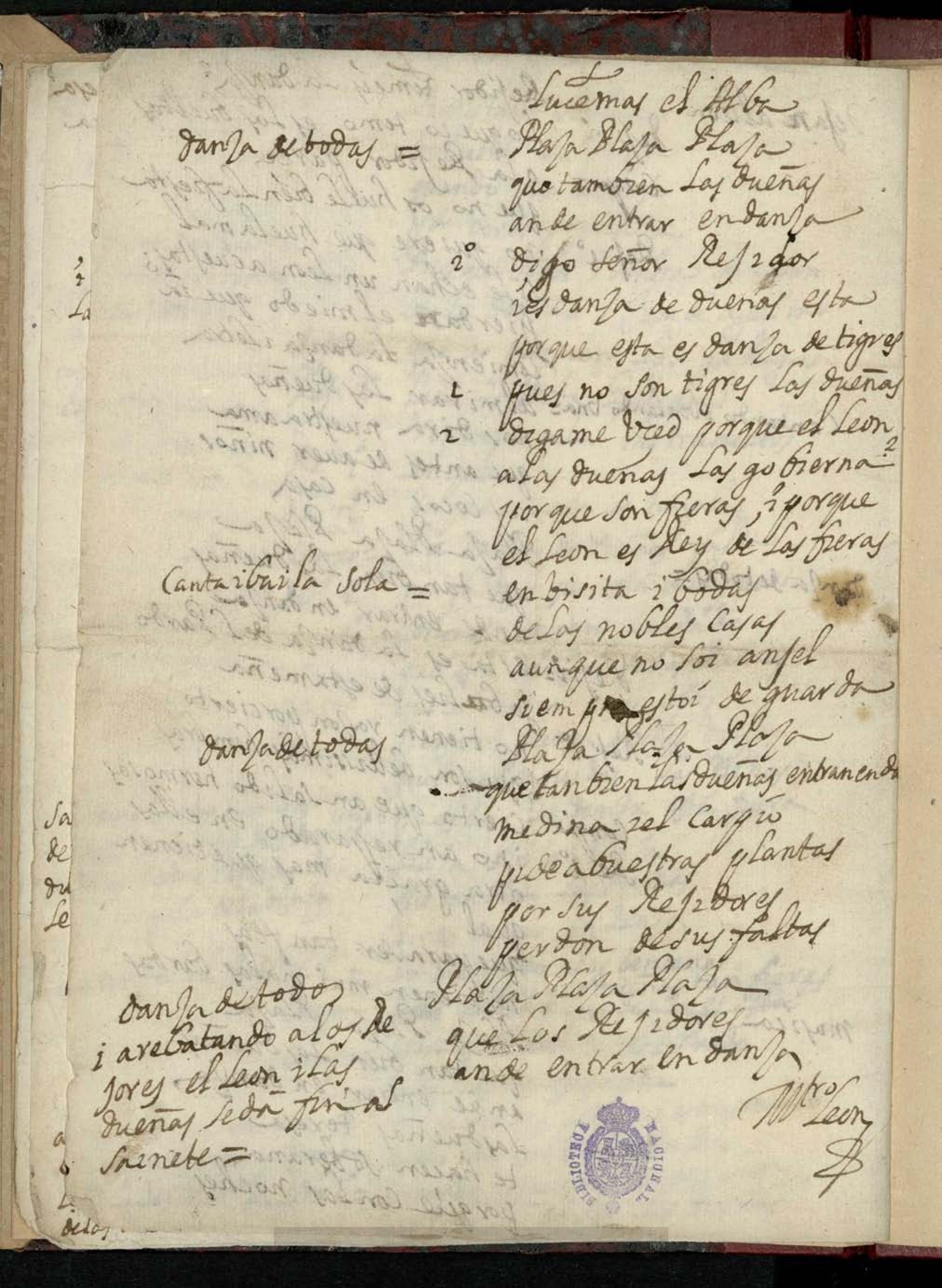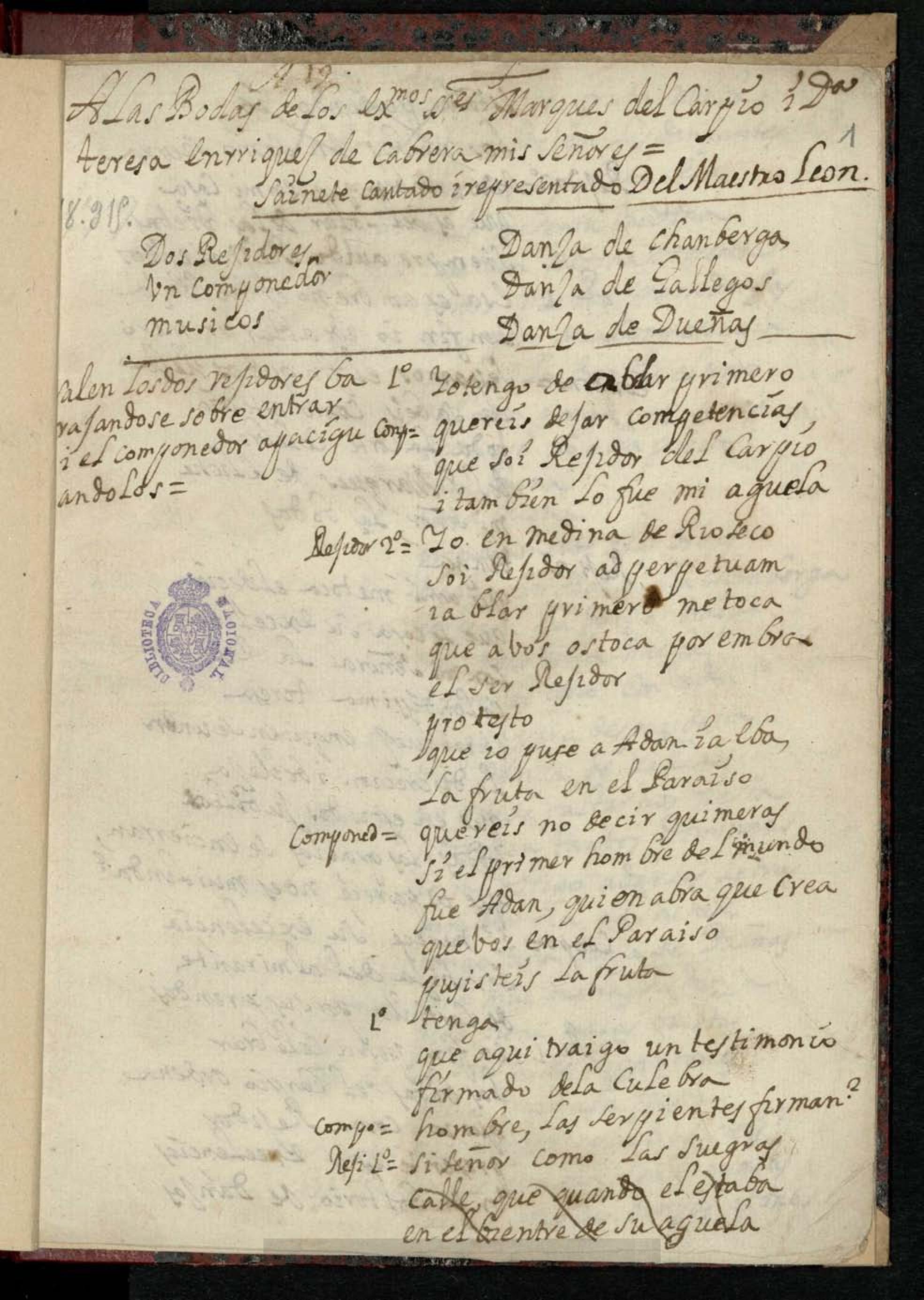 Notas: 1) 4 hojas 2) Ms. autógrafo, con firma y rúbrica del "Mtro Leon" en el f.4v. La escritura se hace menos cuidada a partir del f.3v 3) En el ms. el título es "A las bodas de los excelentísimos señores marqués del Carpio y dña. Teresa Enríquez de Cabrera, mis señores", aunque URZÁIZ [396] lo cataloga como "Los dos regidores". El matrimonio entre Gaspar de Haro y Guzmán, marqués del Carpio, y Teresa Enríquez de Cabrera tuvo lugar en 1671, por lo que es probable que este ms. date de dicho año 4) Texto a una columna, situada en la mitad derecha del folio, quedando el lado izquierdo para los nombres de los personajes que intervienen y las acotaciones 5) Algunos versos tachados en f.1r, f.2v. y f.3v. En este último hay una corrección del dramaturgo |