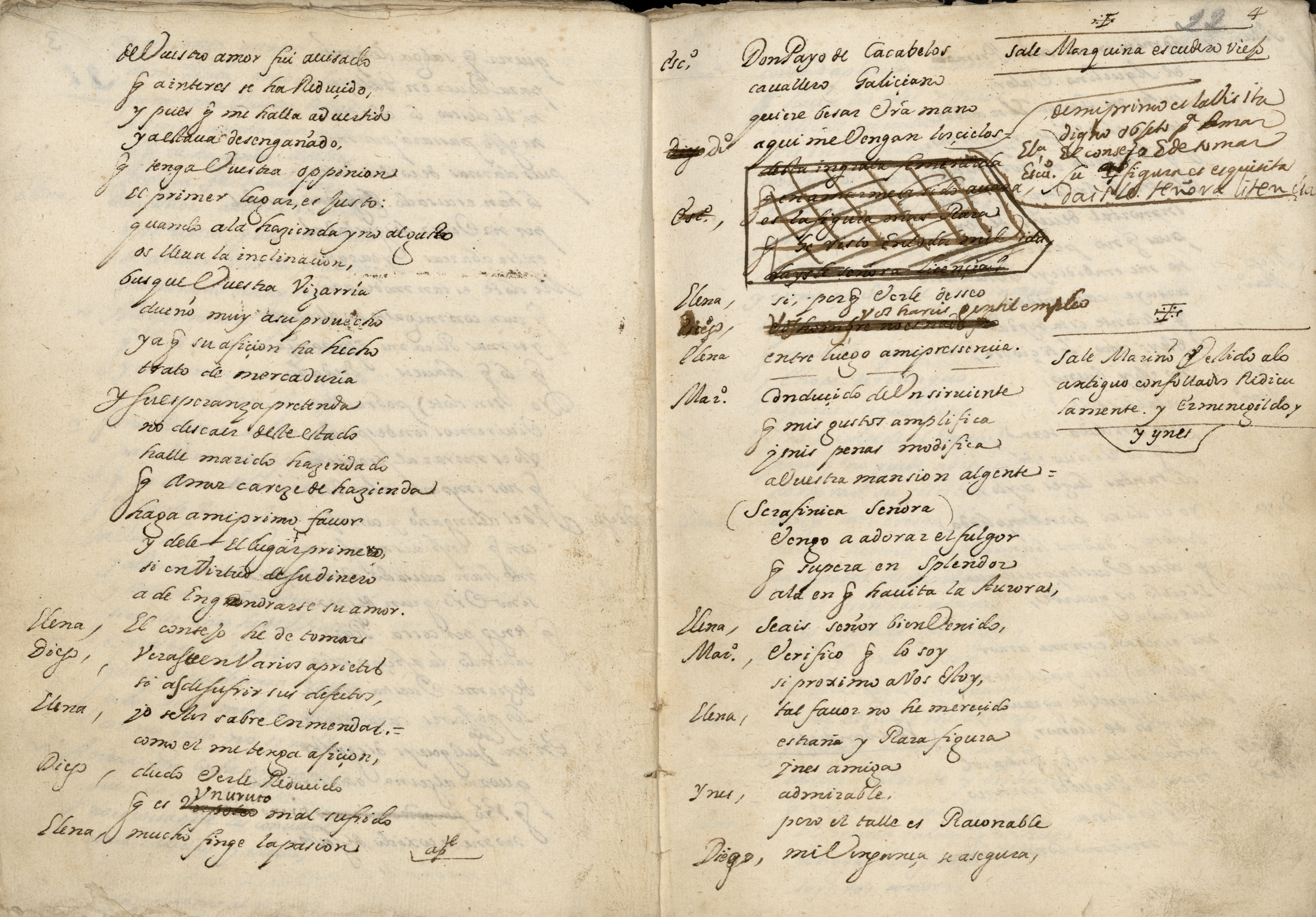 Notas: 1) PM: autógrafa, firmada y con fecha en Zaragoza a 31/10/1638. Licencias de Navarro de Espinosa en Madrid, a 12/1638 2) En f.56v figura la siguiente nota: "Alabado sea el ss.mo sacramento, y la puriss.a concepcion de nra. sra. concebida sin mancha de pecado original. Acabosse en zaragoza en postrero de octubre 1638. don Alonso de castillo solorzano 3) El manuscrito incluye en f. 57r una licencia de representación fechada 28/12/1638 4) Aunque el manuscrito está escrito a una sola columna, en el f.18r y f.56v se utilizan dos columnas 5) En f.5r, f.10r, f.12r, f.12v, f.13r, f.14r, f.15r, f.27r, f.29r, f.33r, f.42v, f.46r hay correcciones de mano del dramaturgo. ¿Y en f.11r y f.40r? 6) Corrección de otras manos en f.5r, f.7r, f.17v, f.20r, f.21r, f.22r, f.25r, f.26r, f.32r-f.32v, f.36r, f.50v, f.52v 7) Hay pasajes atajados en f.9v, f.13v, f.14r, f.17r, f.19v, f.22r, f.29v, f.35r, f.42r, f.44v-f.45r, f.51v-f.52r, f.52v, f.56r, f.56v 8) En el f.36r, al final de la segunda jornada, otra mano anota "874 rs." y, más abajo, "882" 9) Una mano distinta ha hecho varias florituras en el f.36v, donde también ha escrito "el Reynos", y en f.37r. En el f.38r, además de las florituras, la misma mano ha escrito "Puedese Representar esta Comedia" y luego lo ha tachado |