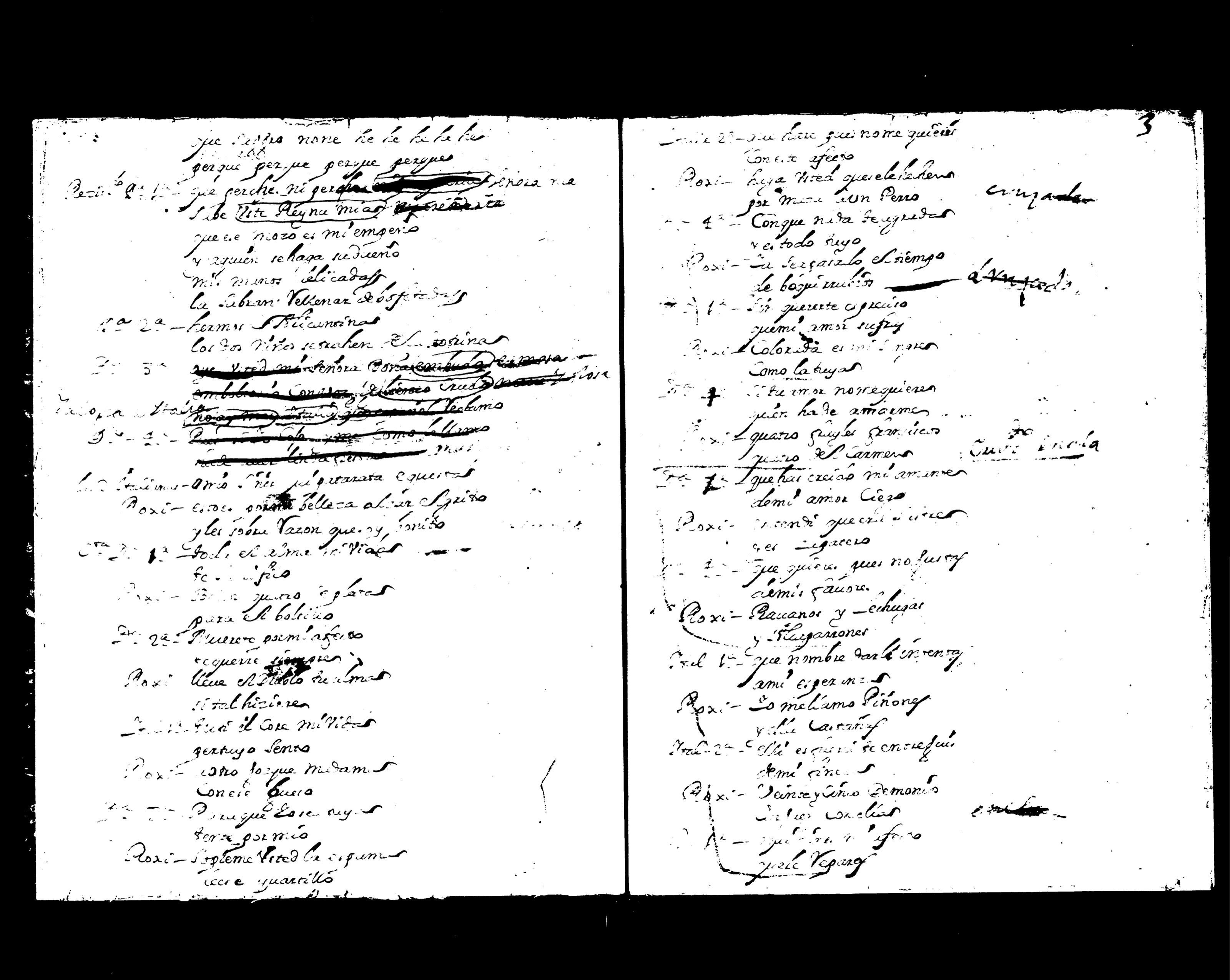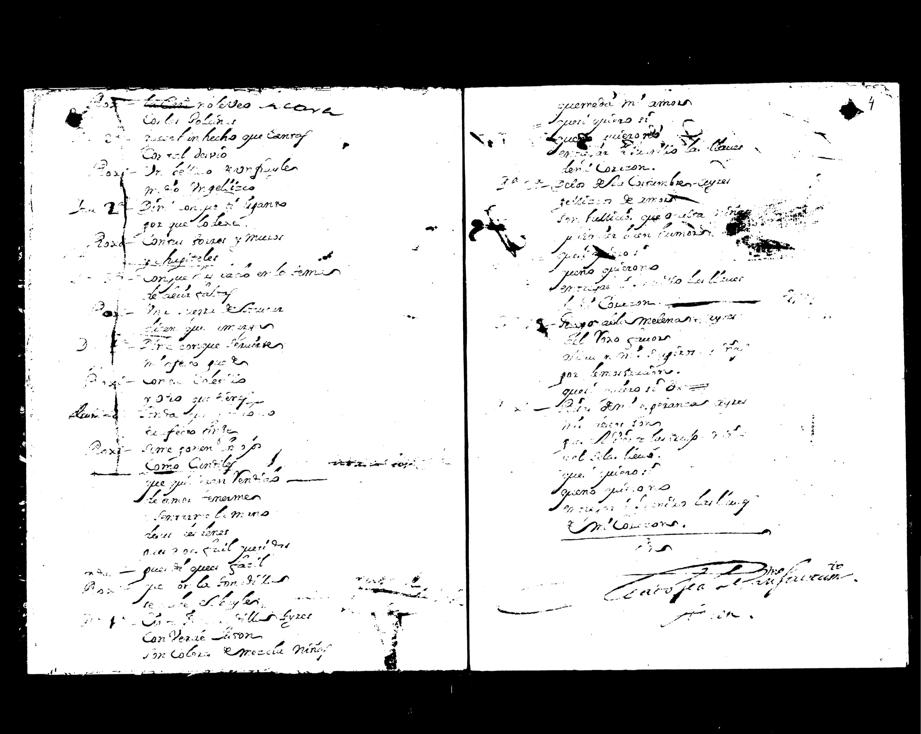 Folios de Muestra: Micro 11.058; todo; 14 fot. Microfilm del ms. entero pedido 15/03/2001 Digitalización a 300 dpi pedida 11/06/2013 de: ff. 2v-4r: "que saggra none he he he he he...//Italia 2ª que hace pues no me quieres...//Roxi - [tachado] no le veo la cara...//....loado sez le Recibidas 16/08/2013 |