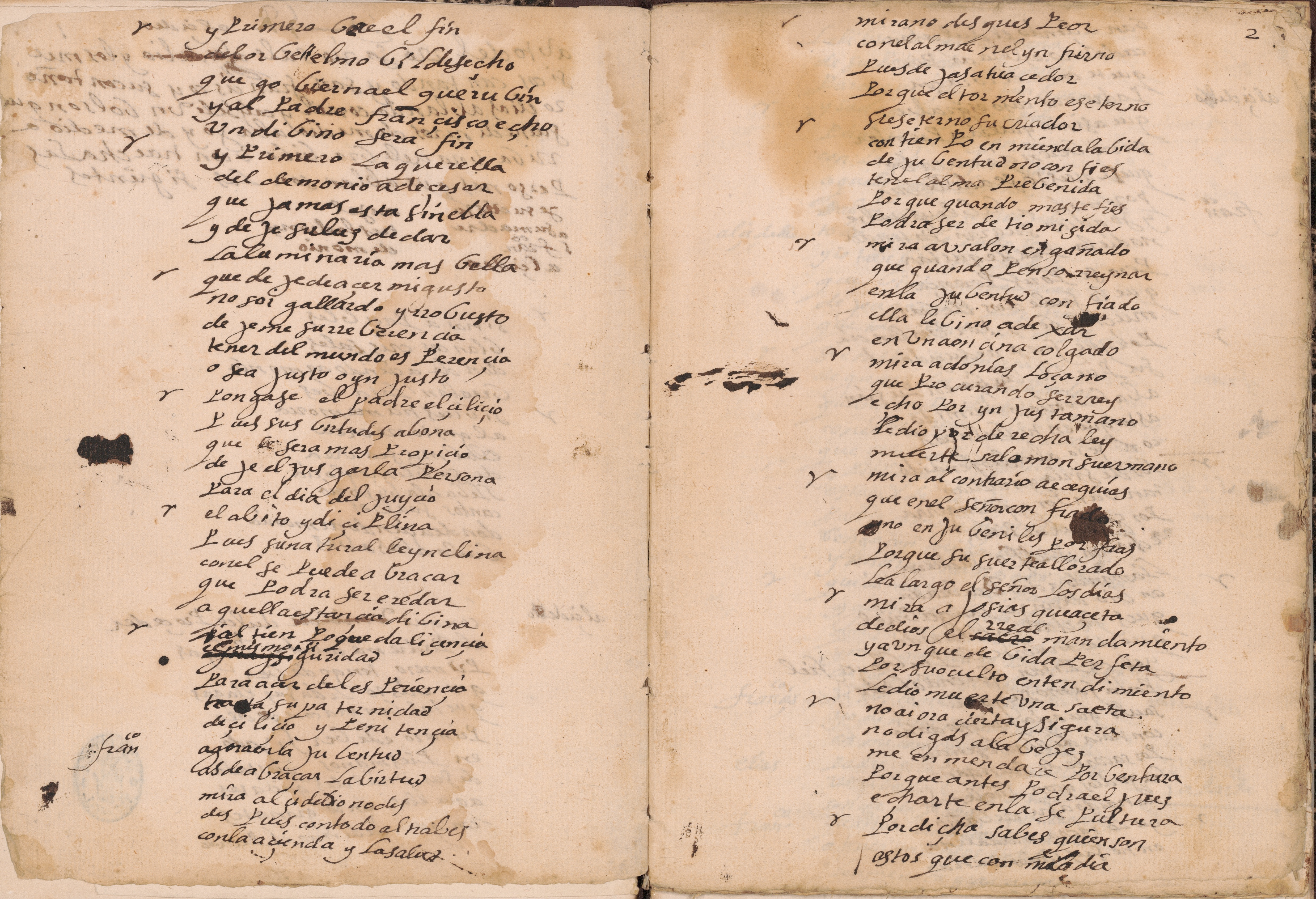 Folios de Muestra: Digitalización a 300 dpi pedida el 06/06/2013 de: ff. 16v-17r: "alcide buelbe en ti que bas perdido...//...el pecho mas escabroso" ff. 20v-21r: "juez sacro poderoso...// ...de 1611 Lcdo. Juº de Soto" Recibidas 16/08/2013 - imágenes distorsionadas, estrechas |