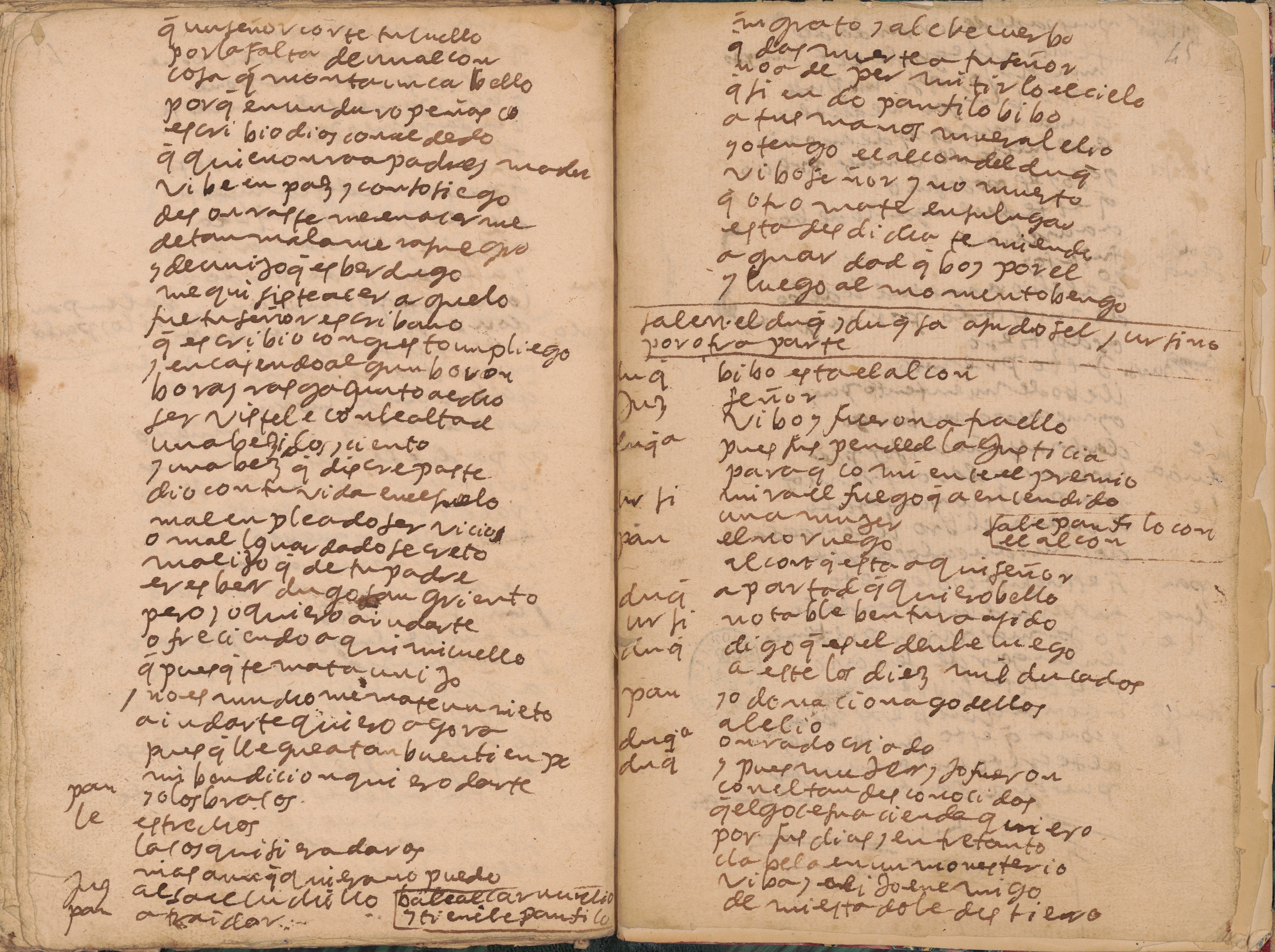 Folios de Muestra: Micro 2041; 45 hojas BDH PID 3167458 Digitalización a 300 dpi pedida 17/06/2013 de: ff. 1v-2r: "muchos tras su inclinación...//...y en paz a mi han<?> dejado" ff. 18v-19r: "memorias y papeles <?>...//...benis <?temis?> a perder la echurra" Recibidas 16/08/2013; distorsionadas, estrechas Micro del ms. entero pedido 15/03/2001 |