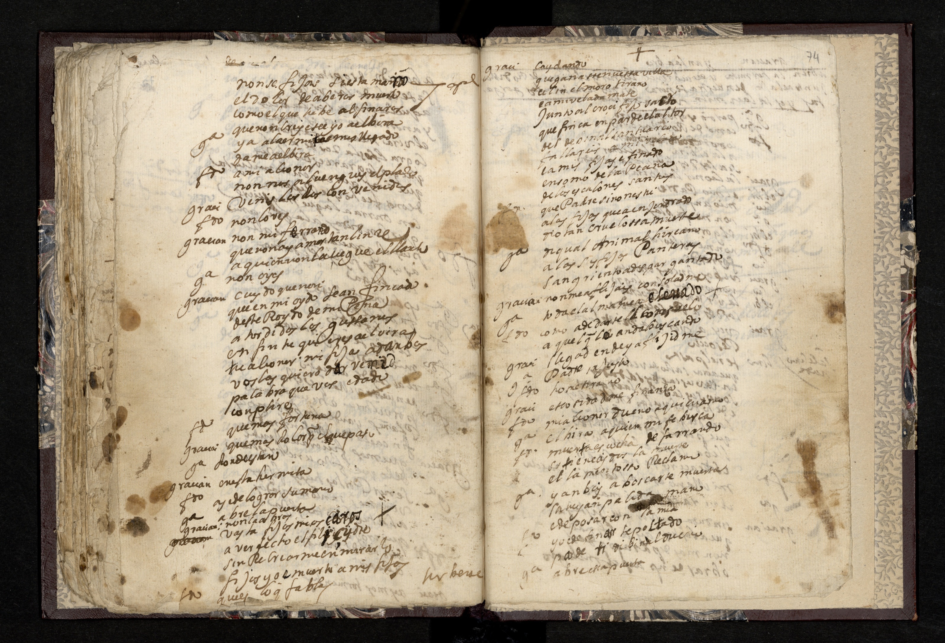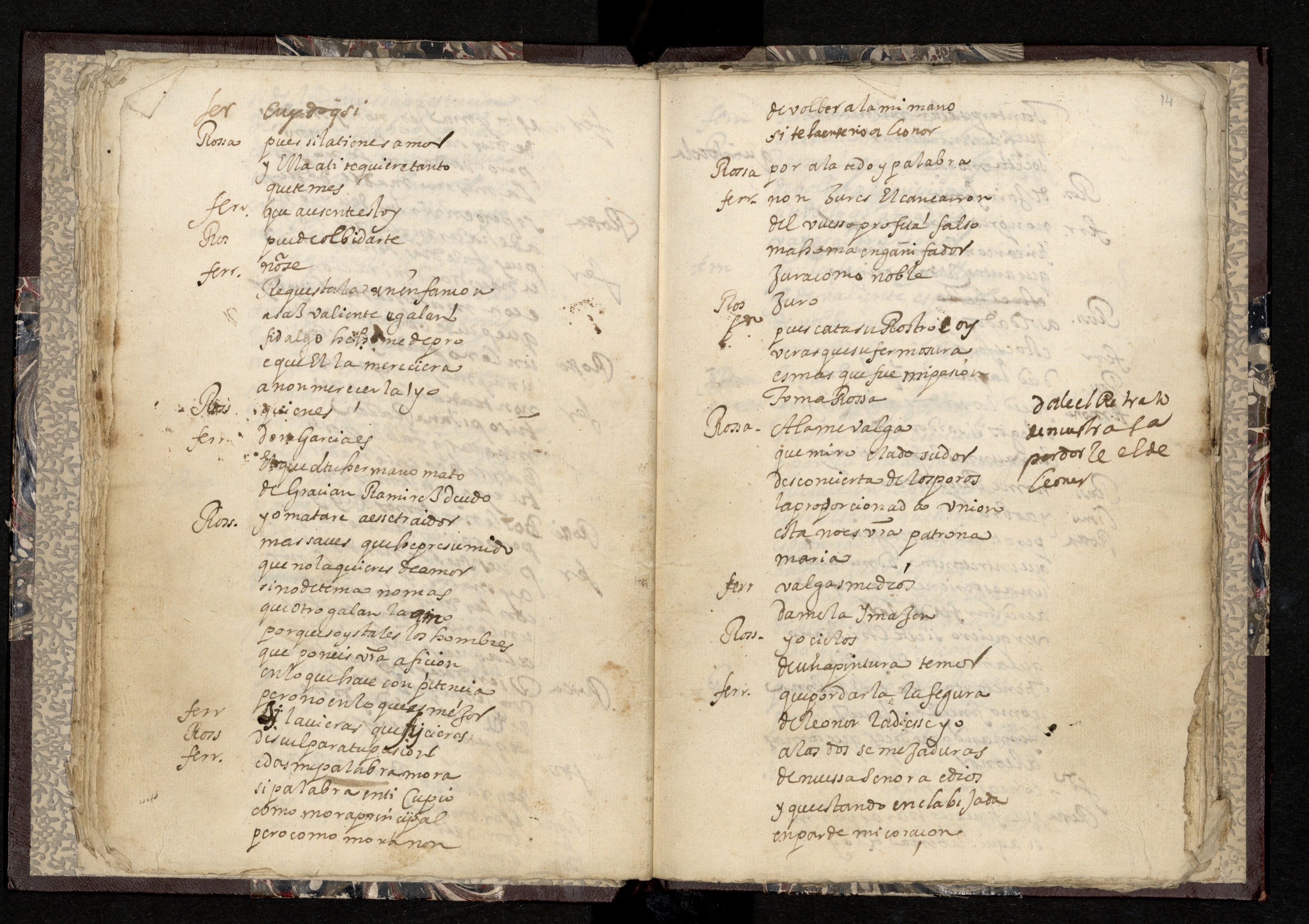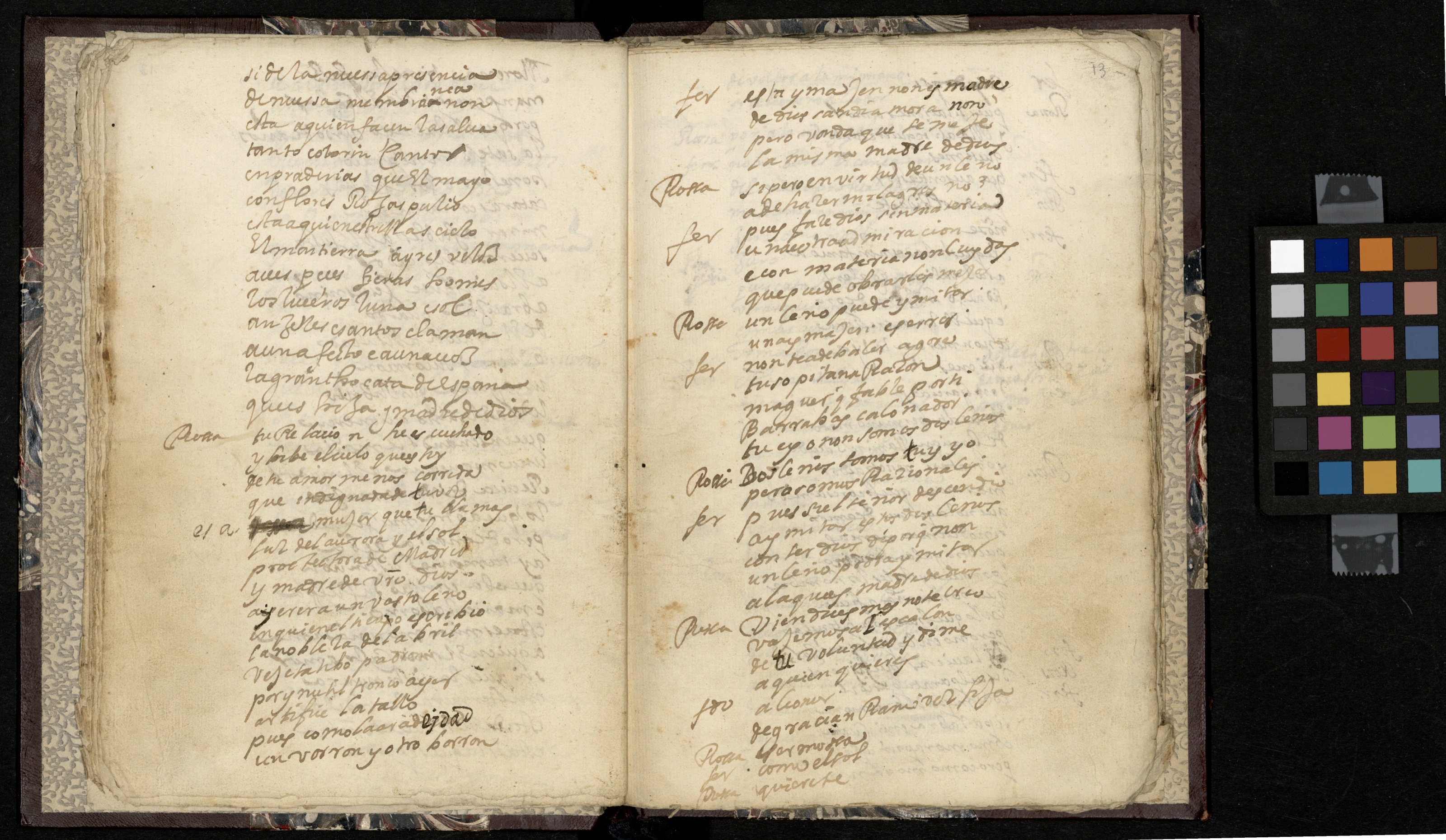 Folios de Muestra: BNE Biblioteca Digital Hispánica PID 1673458 Micro 6583 - 77 fot. Digitalización a 300 dpi pedida 21/06/2012 de: 1r: "382 Nª Sª de atocha .... S. Ja[cin]ta Rosa" f.2r-f.2v: "Salen Rossa mora vestida de negro .../... han de asustarse all golpe de mi açero" f.12v-f.14r: "si de la nuessa presencia ... / ... en par de mi coraçon" f.73v-f.75r: "non se fijons (?) si esta mano ... / …Representese" ff. 2r, 2v y 13v-14r de M332 entrados en ManosID Recibidas 25/09/2012 |