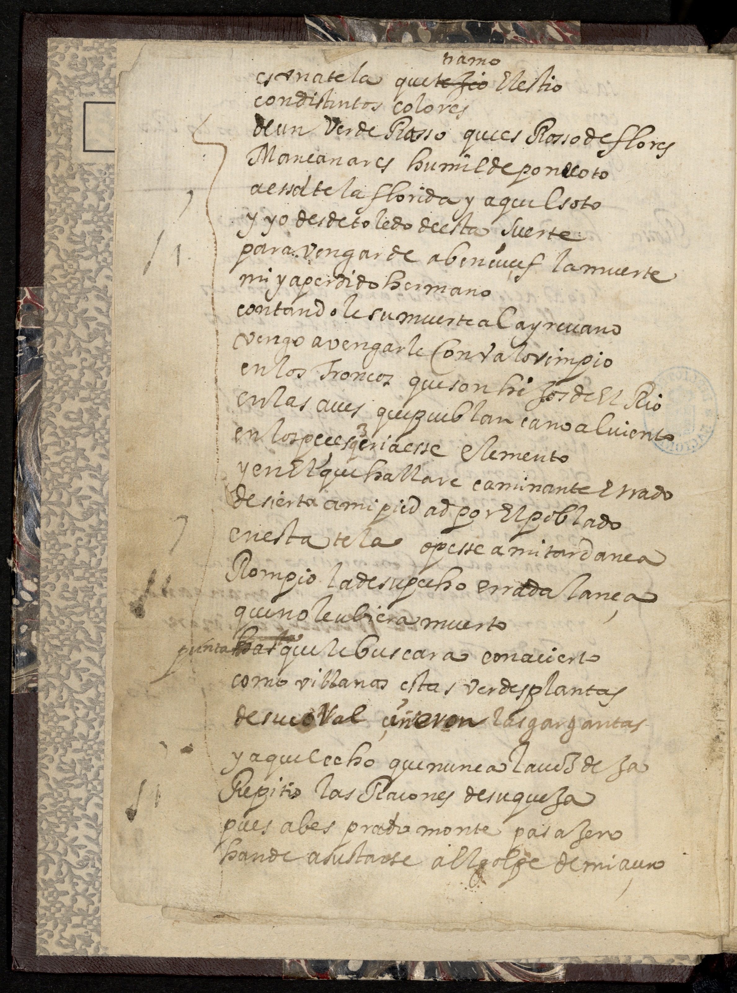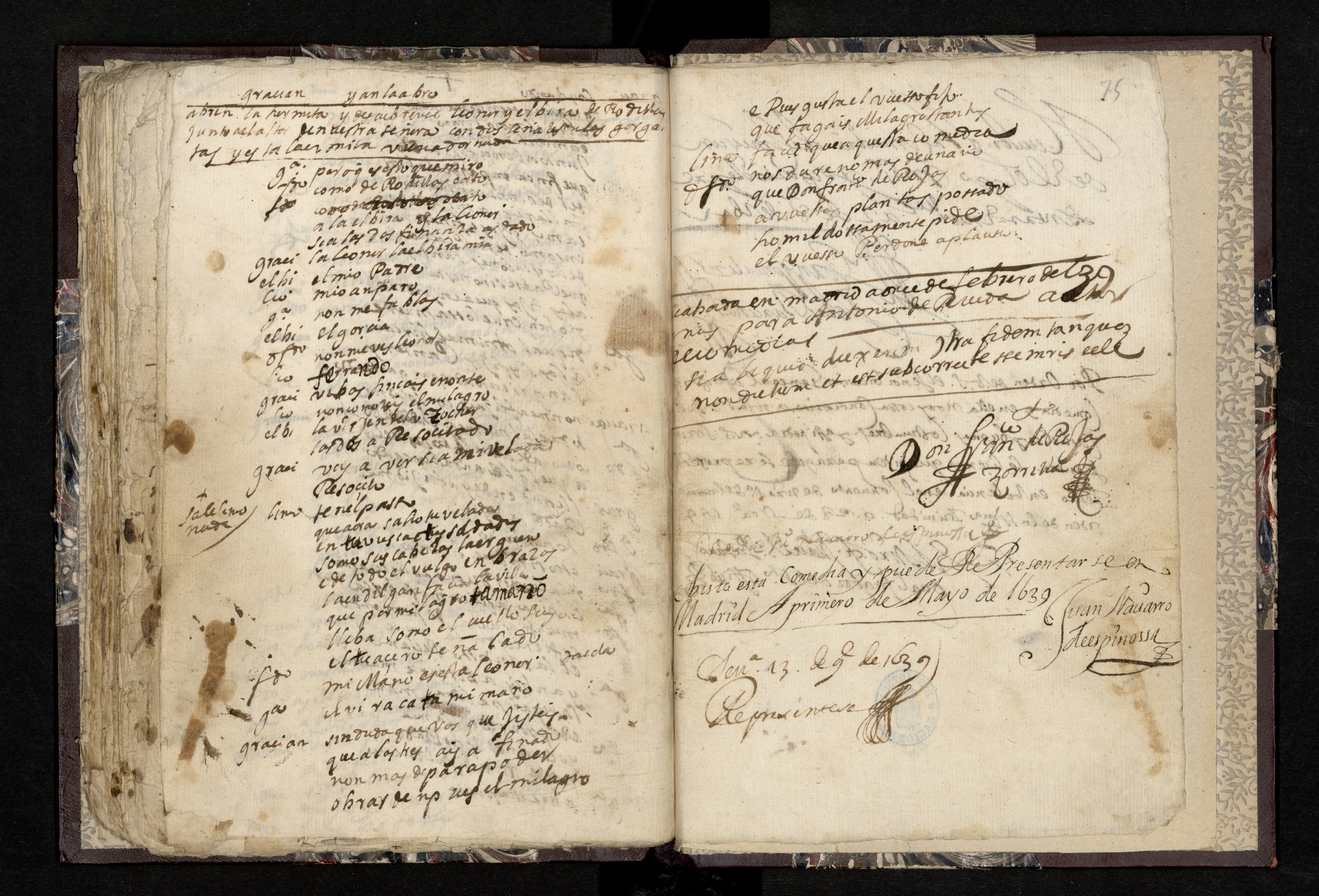 Notas: 1) 75 hojas 2) PM: autógrafa y firmada en la última hoja con la nota siguiente: "Acabada en Madrid a 11 de febrero de 1639 años, para Antonio de Rueda, autor de comedias". Licencias de Navarro de Espinosa de 1 mayo 1639 3) MG: hay licencias para Córdoba a 02/10/1642 y Valencia 28/11/1642. Al final de la jornada II, "Fin de la segunda jornada de la Virjen de Atocha de D. Fr.co de Rojas escrita para antonio de Rueda autor de comedias por su Mag.d en la Villa de Md."; firma al final de la jornada II (f.75r), "Francisco de Rojas Zorrilla", pero no parece haber sido copiado por una sola mano 4) f. 75r-v: Las aprobaciones y licencias del manuscrito están fechadas el 01/05/1639, el 13/11/1639, el 02/10/1641 y el 28/11/1642; Ver R072 5) f. 1r: lista de actores. Ver R072 6) Rojas Z añade algunas líneas a las hojas escritas por M332 (ver notas a aquella mano), y otras correcciones. Ej: f. 16v, la acotación 7) Tanto las hojas escritas por Rojas como por M332 llevan correcciones de palabras y líneas por otra mano con una pluma muy gruesa que escribe sobre las originales. Ver p.ej., f. 18v, f. 56r, f. 63r, f74v; algunas de las correcciones de M332 podrían ser de Rojas Z. 8) Las correcciones en otra mano que D012 o M332 podrían ser del autor Antonio de Rueda o de su apuntador |