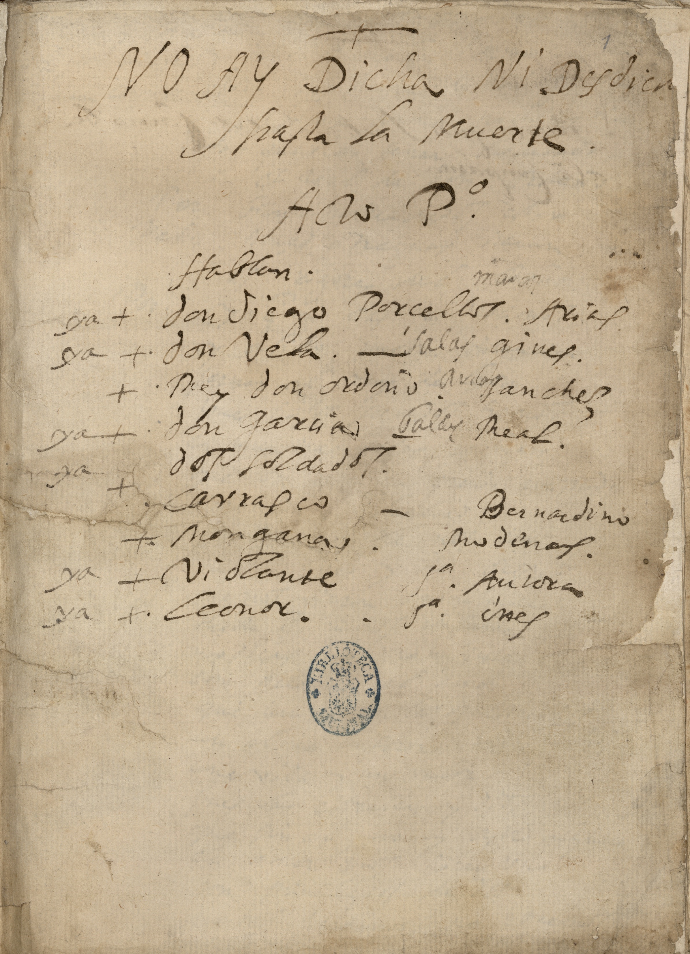 1) Ms. 0058, BNE Res. 76, "No hay dicha ni desdicha hasta la muerte" 2) El manuscrito incluye tres repartos diferentes. Los dos primeros acompañan al elenco de la primera jornada, en el f.1r. El primero de ellos es casi completo y es el más temprano de los dos, mientras que el segundo sólo incluye cuatro nombres añadidos con posterioridad al lado del primer reparto. El tercer reparto en el manuscrito acompaña al elenco de la segunda jornada, en el f.18r, y, aunque algunos actores coinciden con los del primer reparto, parece corresponder a una representación diferente. Damos cuenta aquí del primero de los repartos. No podemos identificar con seguridad a todos los actores que figuran en él y los datos disponibles presentan numerosas lagunas, pero, puesto que sabemos que la comedia se escribió para Andrés de la Vega, es probable que corresponda a la compañía que tuvo en 1629. ¿Quizá está relacionado con la licencia de representación fechada en este año? 3) El manuscrito incluye licencias de representación fechadas el 17/04/1629 y el 08/11/1636 |